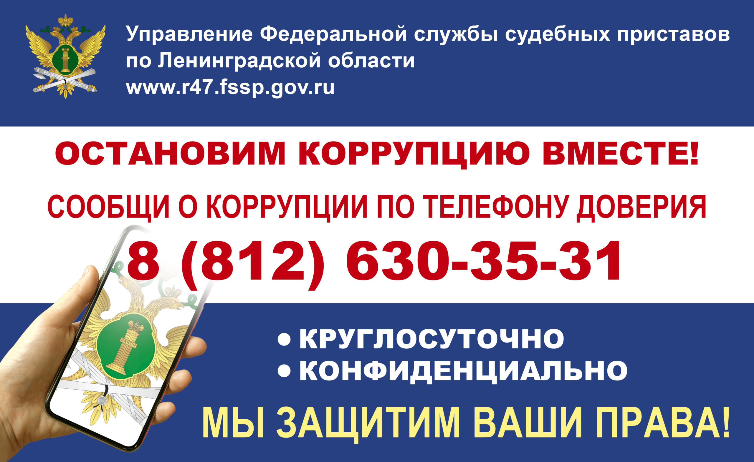 Напоминаем, что в УФССП России по Ленинградской области в круглосуточном режиме работает «телефон доверия» 8 (812) 630 35 31, по которому можно сообщить о противоправных действиях со стороны работников территориального органа. По указанному номеру от заявителей принимают и рассматривают информацию: