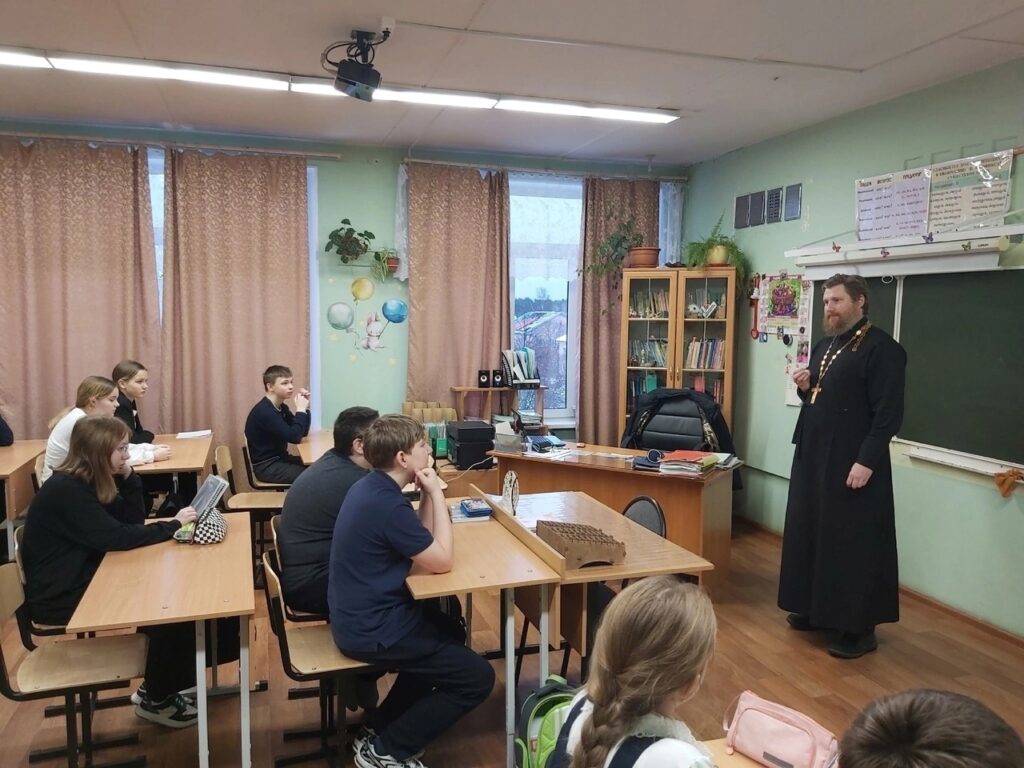 11 февраля помощник благочинного Приозерского округа по вопросам образования и катехизации, штатный священник Приозерского кафедрального собора Рождества Пресвятой Богородицы иерей Олег Каратаев провел урок по духовно-нравственному воспитанию с учащимися 6-го класса СОШ №1 г. Приозерска.Батюшка рассуждал вместе с ребятами о том, что такое любовь к ближнему, в чем она проявляется, в чем разница поступков по принуждению и по любви, можем ли мы сами творить чудеса.
