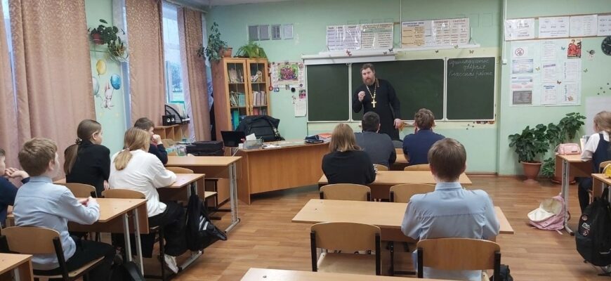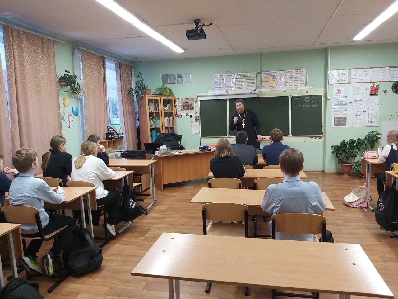 11 февраля помощник благочинного Приозерского округа по вопросам образования и катехизации, штатный священник Приозерского кафедрального собора Рождества Пресвятой Богородицы иерей Олег Каратаев провел урок по духовно-нравственному воспитанию с учащимися 6-го класса СОШ №1 г. Приозерска.Батюшка рассуждал вместе с ребятами о том, что такое любовь к ближнему, в чем она проявляется, в чем разница поступков по принуждению и по любви, можем ли мы сами творить чудеса.