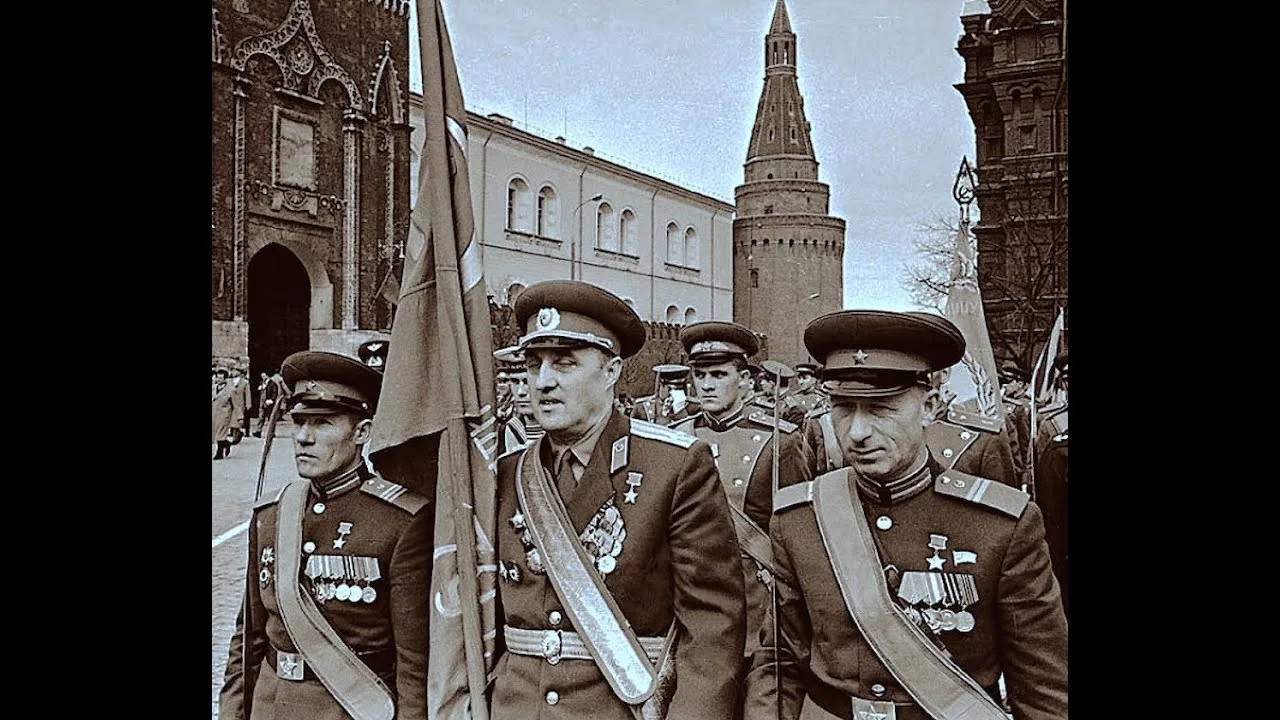 Выносится Знамя Победы. Оно в руках у Константина Самсонова. Ассистенты у него Михаил Егоров и Мелитон Кантария, люди водрузившие Знамя Победы над Рейхстагом…