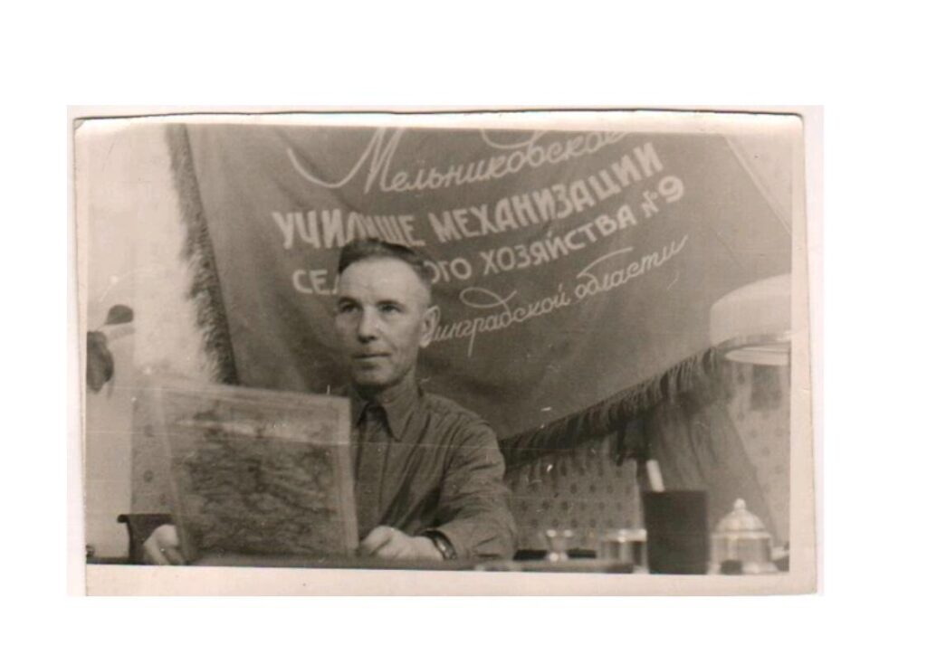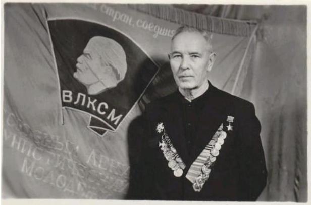 Герой Советского Союза Х.С. Богданов у знамени Мельниковского сельскохозяйственного училища, 1950-е годы. Фотография из коллекции музея-крепости «Корела».