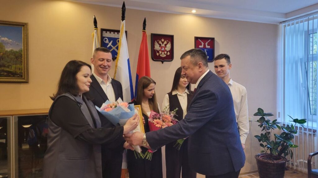 По поручению Губернатора Ленинградской области, глава администрации Приозерского муниципального района Александр Николаевич Соклаков вручил Диплом победителя областного конкурса видеороликов и ценный подарок — профессиональную видеокамеру — команде муниципального общеобразовательного учреждения «Сосновский Центр образования» во главе с директором Ниной Васильевной Окуневой.