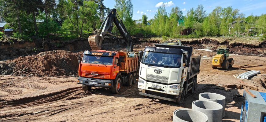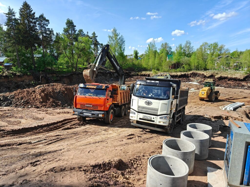 Сейчас идут работы по засыпке, уплотнению грунта и выводу основания под уровень будущего фундамента.