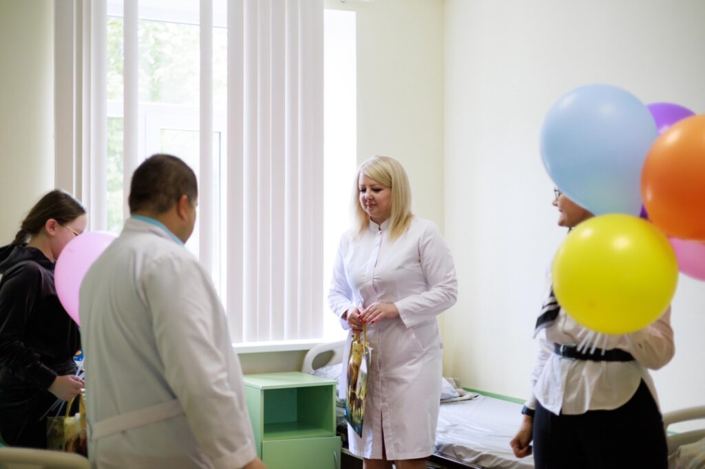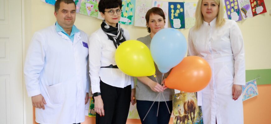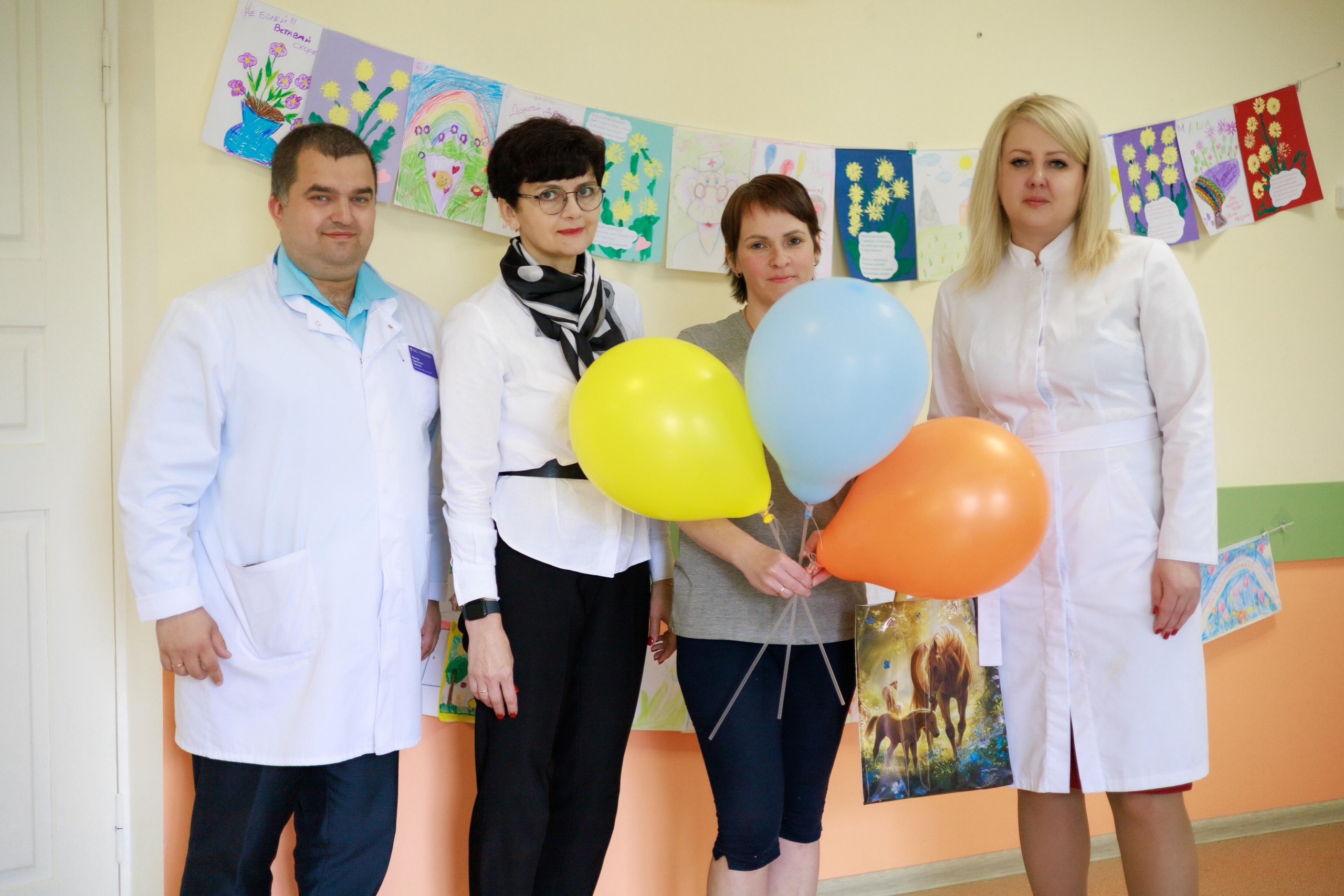 Вместе с главным врачом В. Тарасовым председатель Правления Л. Иванина и член Правления М. Хворова поздравили с праздником, вручили подарки, воздушные шары, пожелали выздоровления, силы духа, радости, исполнения желаний