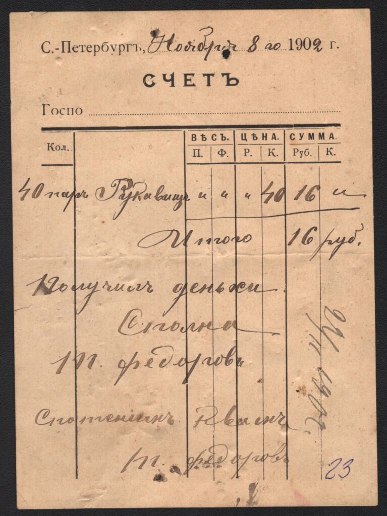 5. Счёт из кожевенной и шпилечной торговли в Петербурге А. Наумова, выписан 8 ноября 1902 года за сорок пар рукавиц.