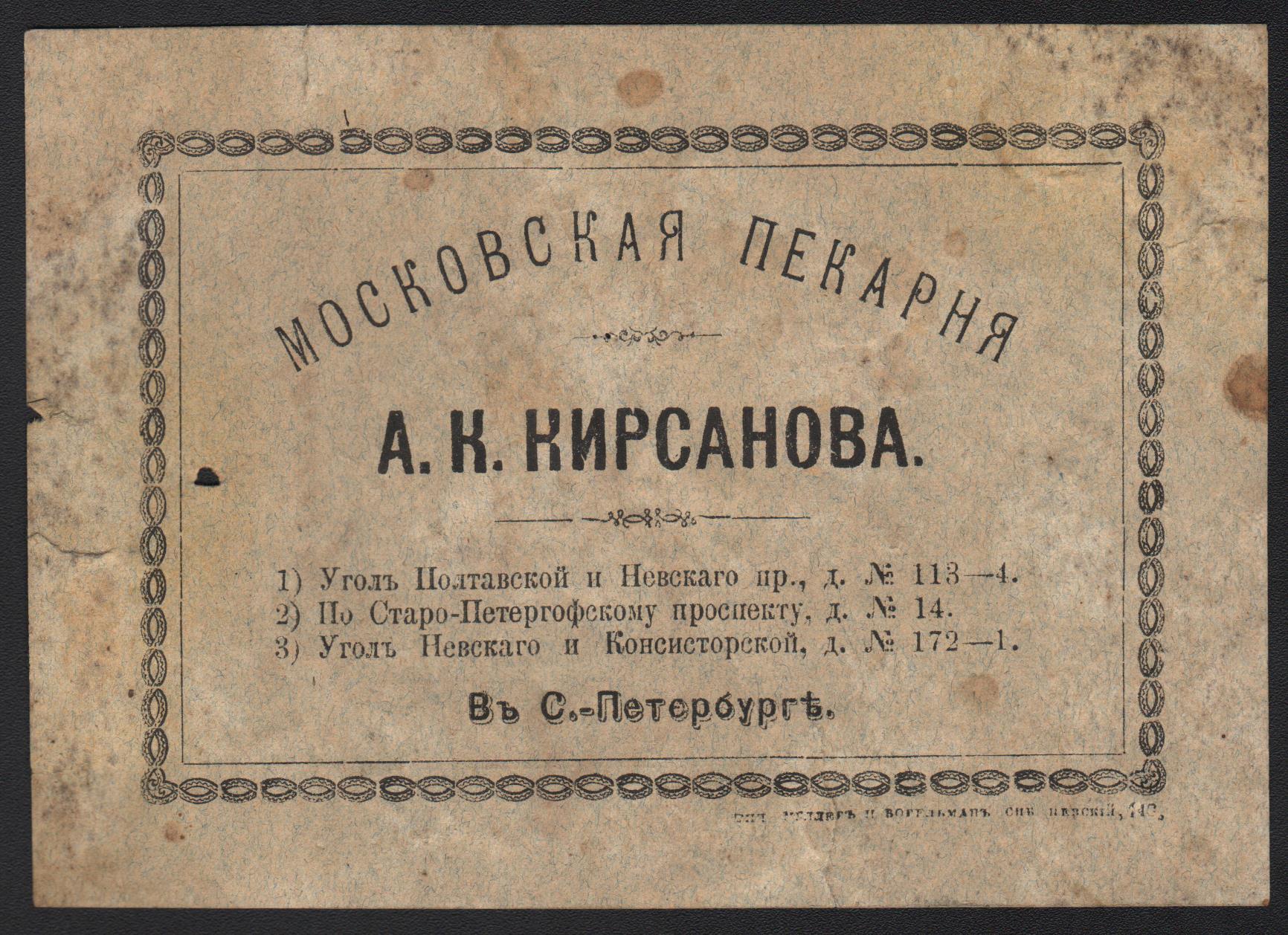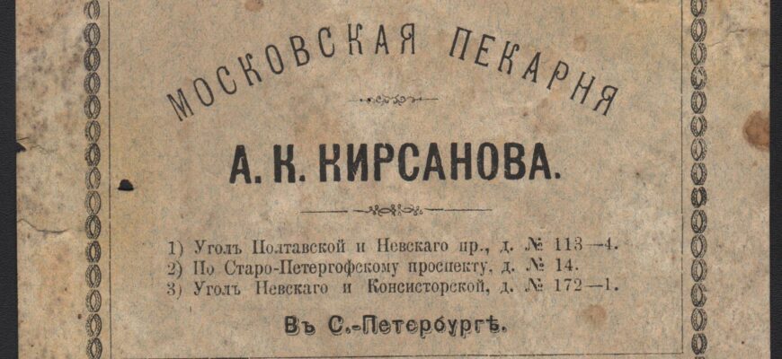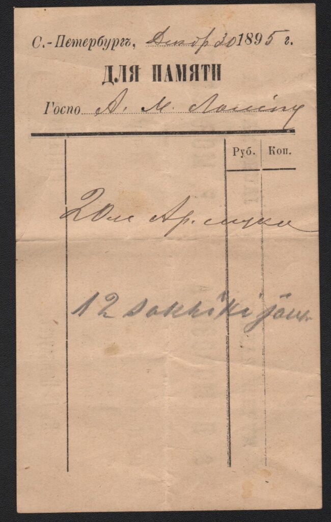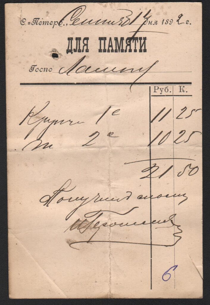 1. Счёт, выписанный господину Ламппу 4 июля 1892 года на получение баранок из московской пекарни А. К. Кирсанова, отделение в Санкт-Петербурге.