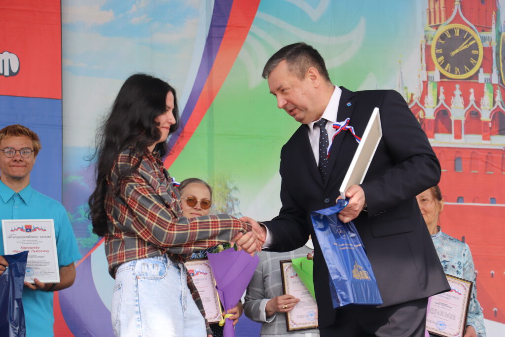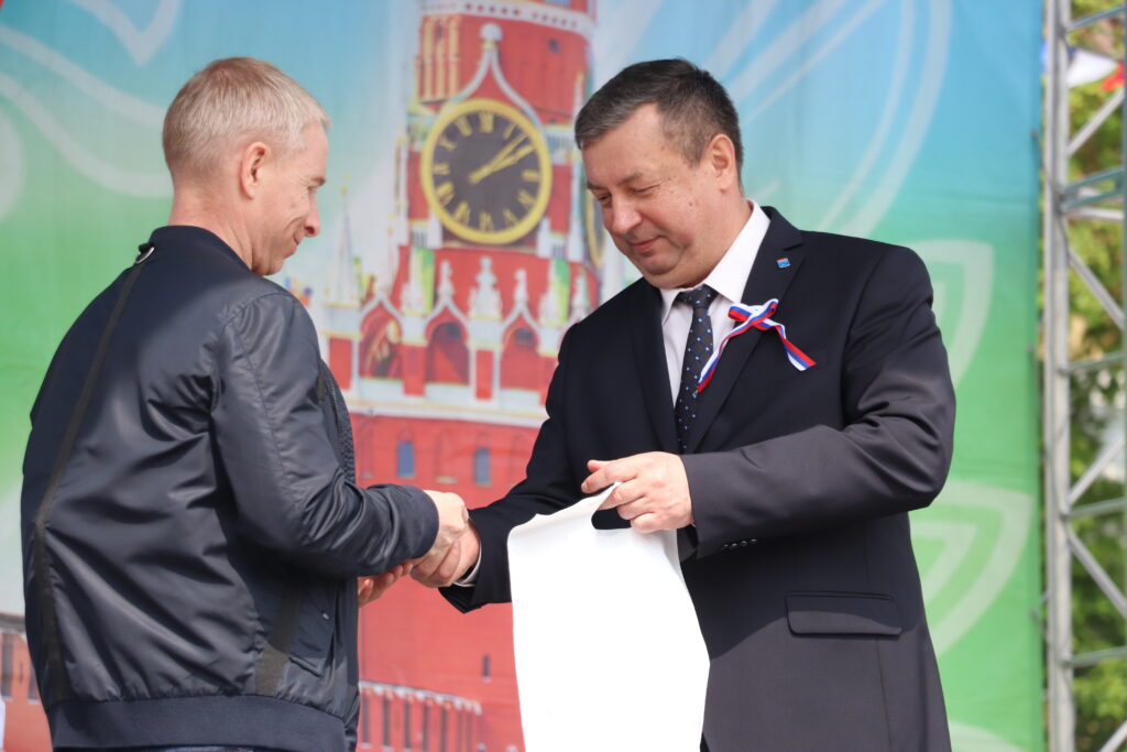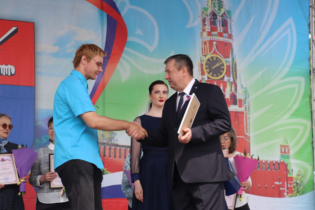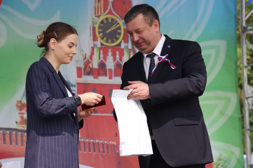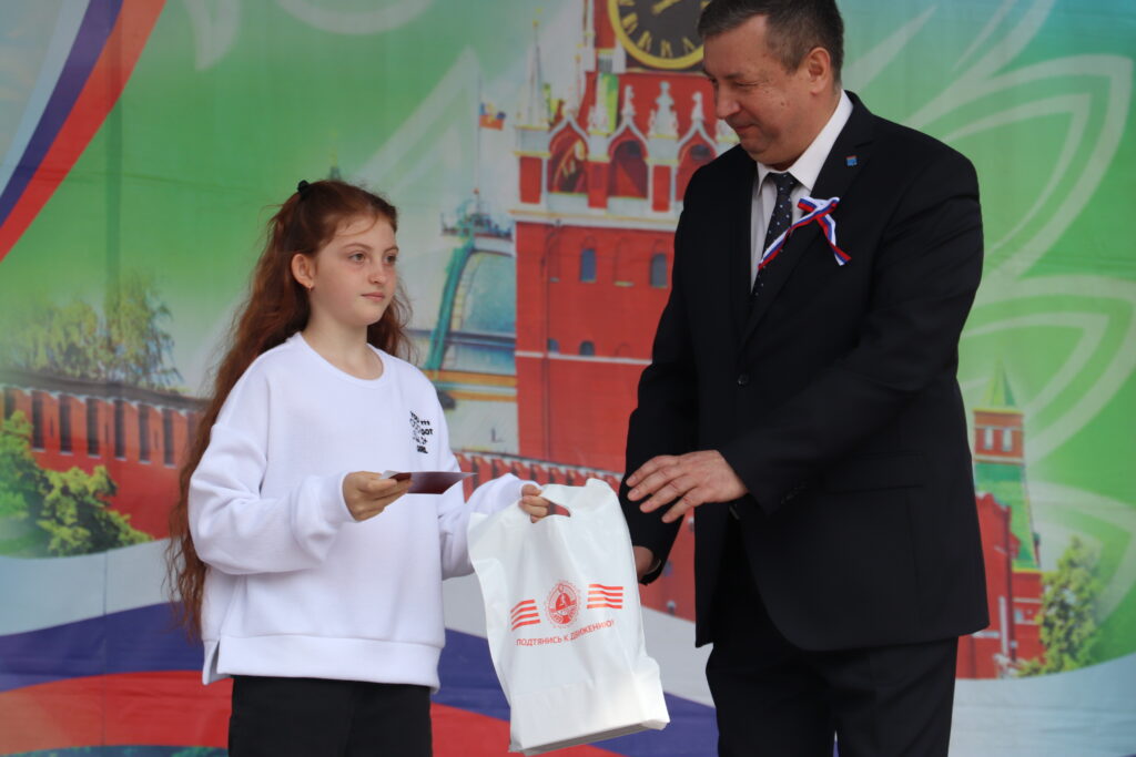 На сцене Глава администрации района Александр Соклаков также вручил золотые значки Всероссийского физкультурно-спортивного комплекса «Готов к труду и обороне» – ГТО!