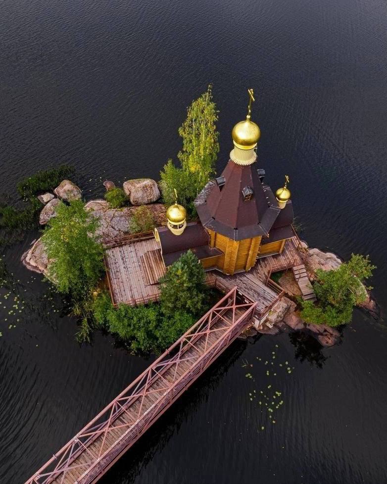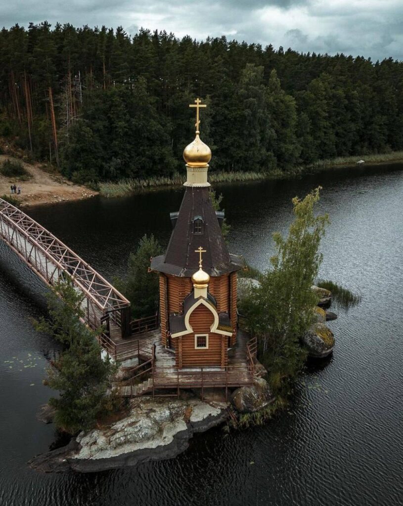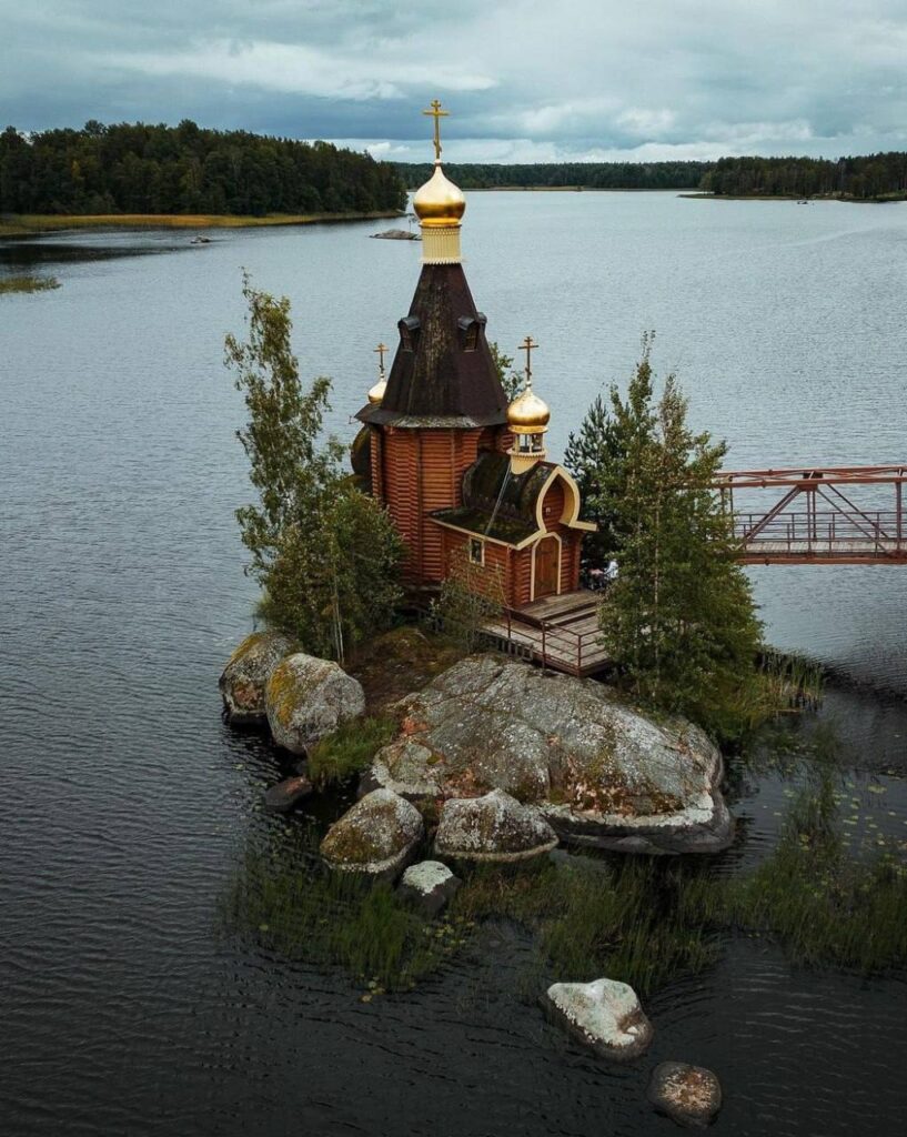 Церковь Андрея Первозванного на Вуоксе — это единственная в мире церковь, занесенная в Книгу рекордов Гиннеса. Она построена на крошечном островке с фундаментом из монолитной скалы, выступающей прямо из воды. Издалека кажется, будто бы здание, построенное по всем канонам древнего зодчества, стоит прямо на водной глади.