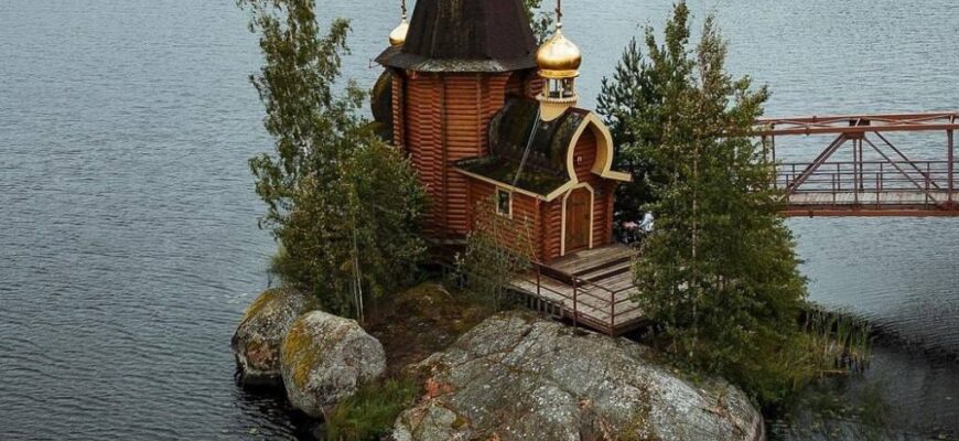 Церковь Андрея Первозванного на Вуоксе — это единственная в мире церковь, занесенная в Книгу рекордов Гиннеса. Она построена на крошечном островке с фундаментом из монолитной скалы, выступающей прямо из воды. Издалека кажется, будто бы здание, построенное по всем канонам древнего зодчества, стоит прямо на водной глади.