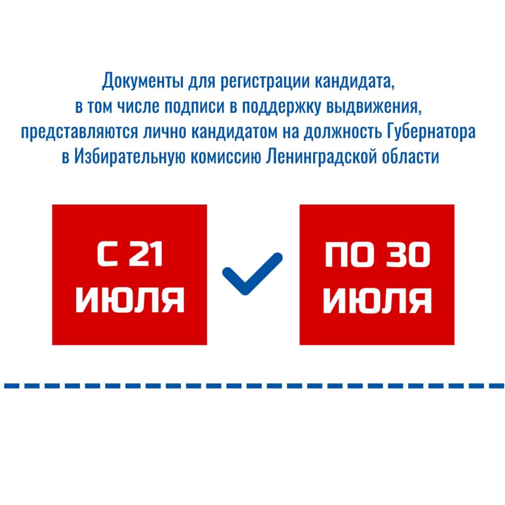 Документы для регистрации кандидата, в том числе подписи в поддержку выдвижения, представляются лично кандидатом на должность Губернатора Ленинградской области в Леноблизбирком в период с 21 по 30 июля (до 18 часов).