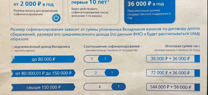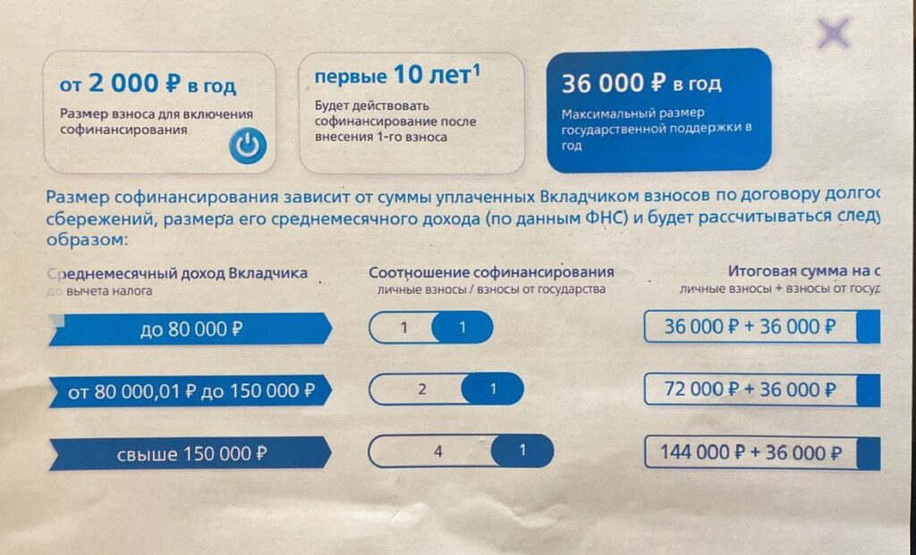 Первые три года государство будет софинансировать вложения — на сумму до 36 тыс. рублей. При этом сумма софинансирования зависит от дохода участника ПДС. Например, если гражданин зарабатывает до 80 тыс. рублей в месяц, формула следующая: 1 рубль взноса на 1 рубль от государства. При высоком доходе формула меняется.