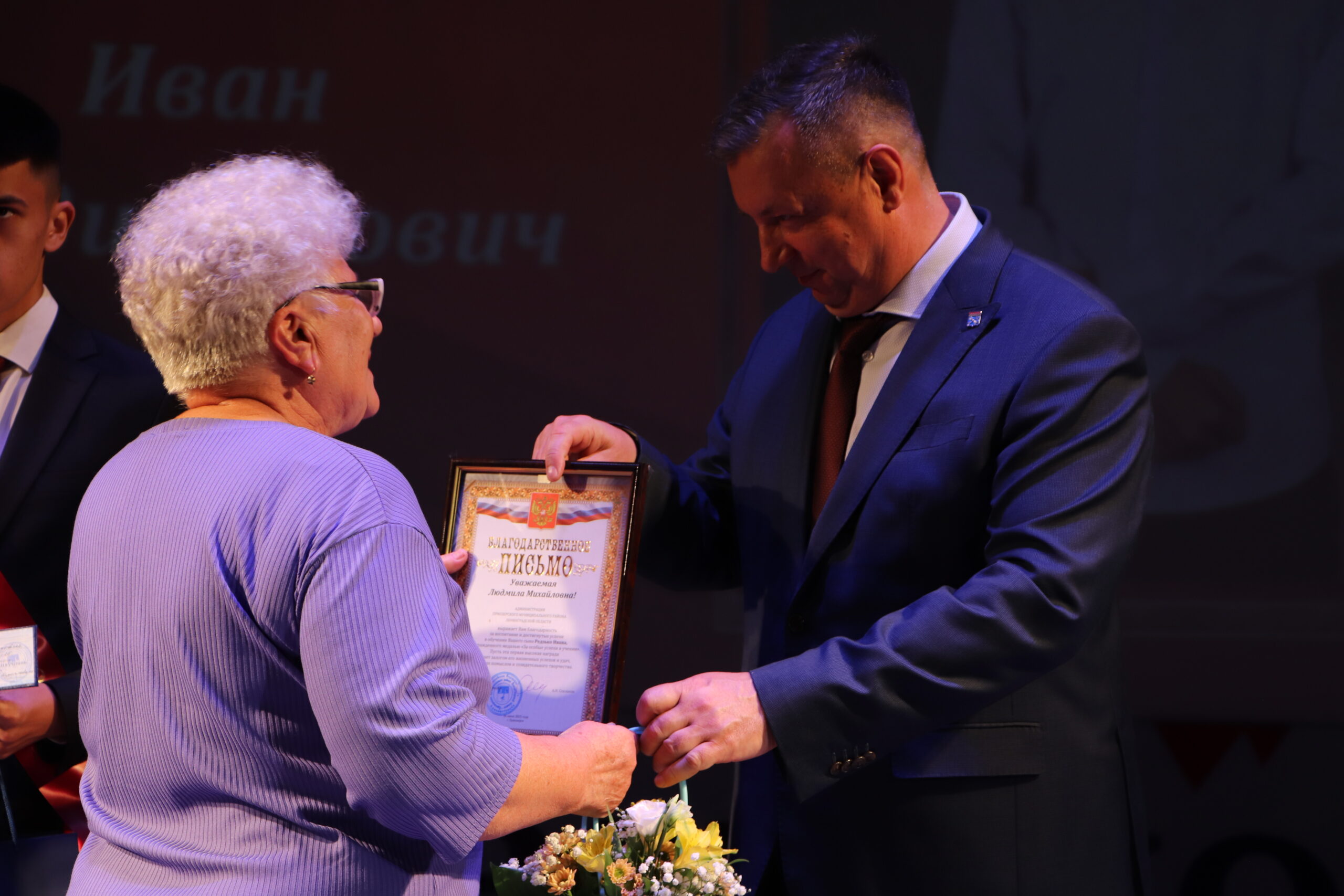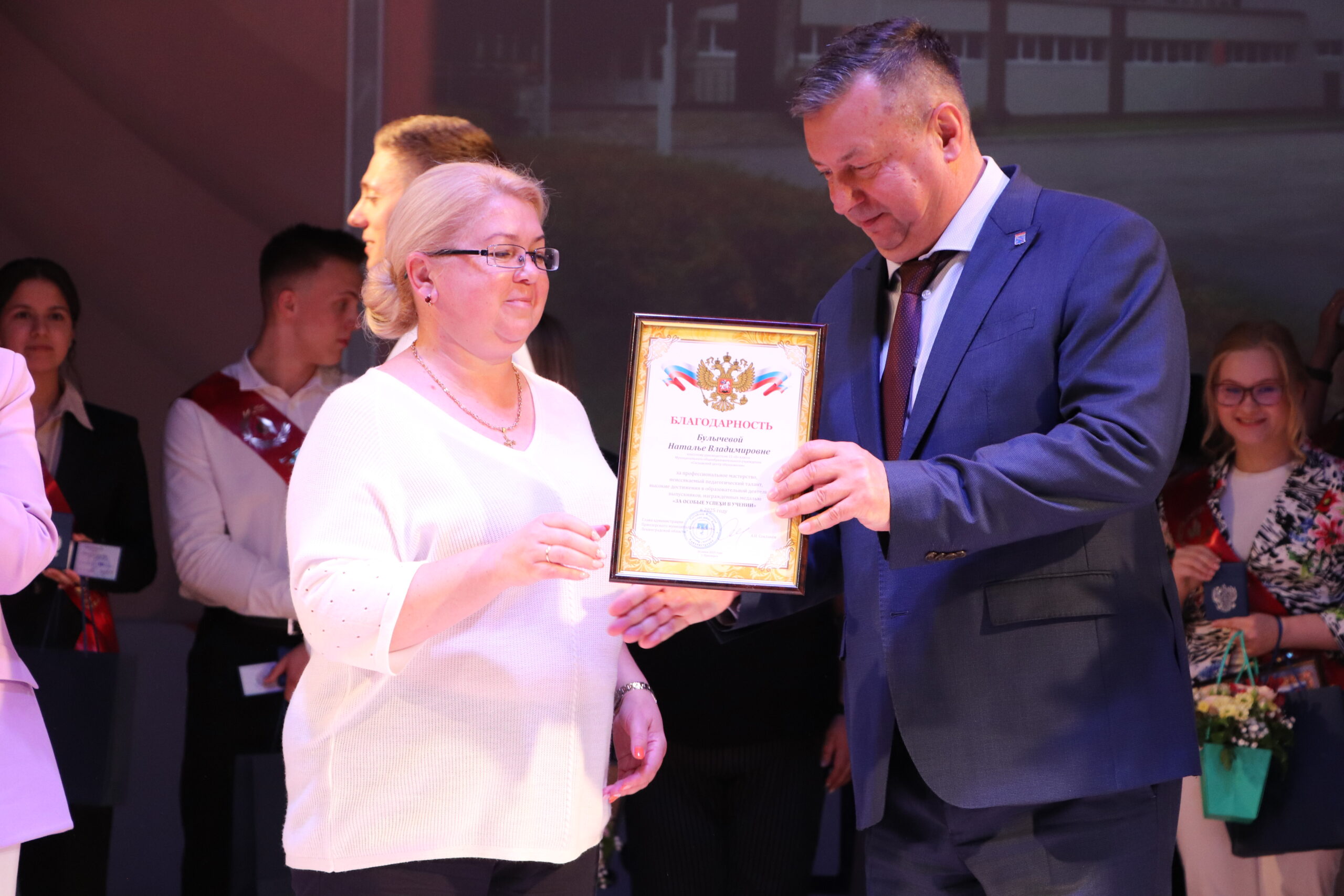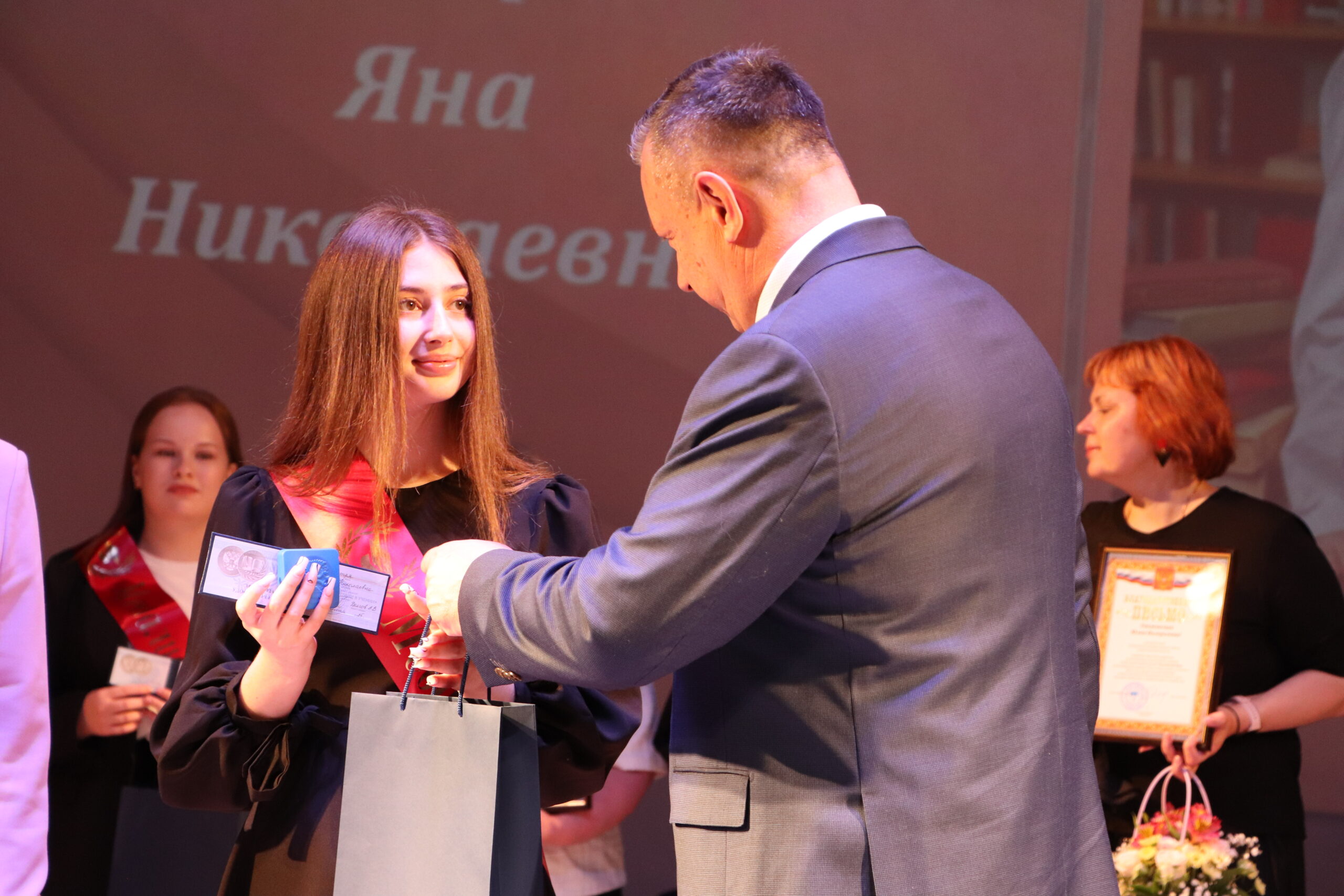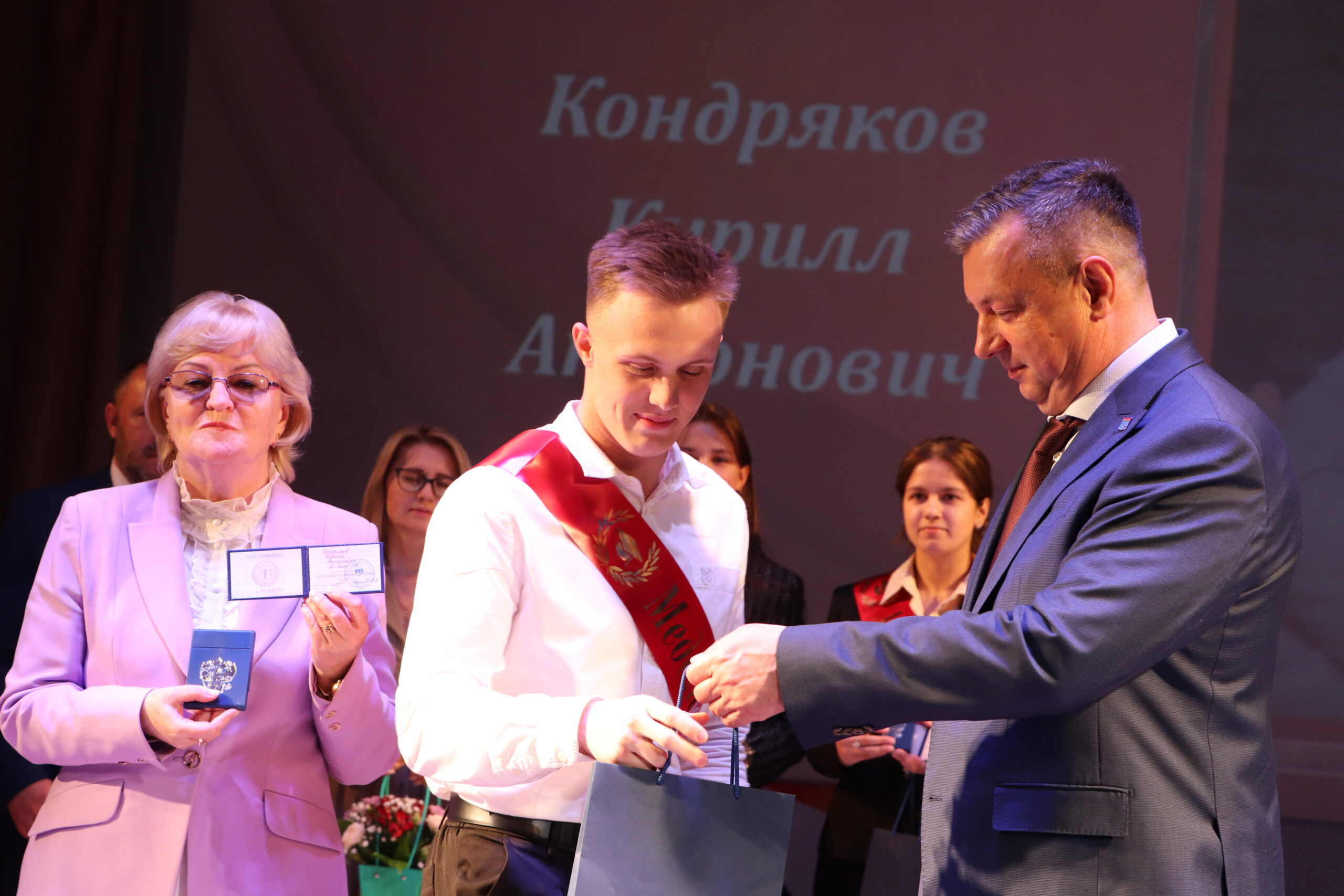 Александр Николаевич совместно с Ириной Кравченко, возглавляющей комитет образования районной администрации, вручили заслуженные награды медалистам, а также благодарственные письма их родителям, педагогам и директорам школ.