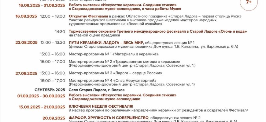 01.09.2025 – 30.09.2025, работа выставки «Искусство керамики. Соединяя стихии» в Староладожском музее-заповеднике;