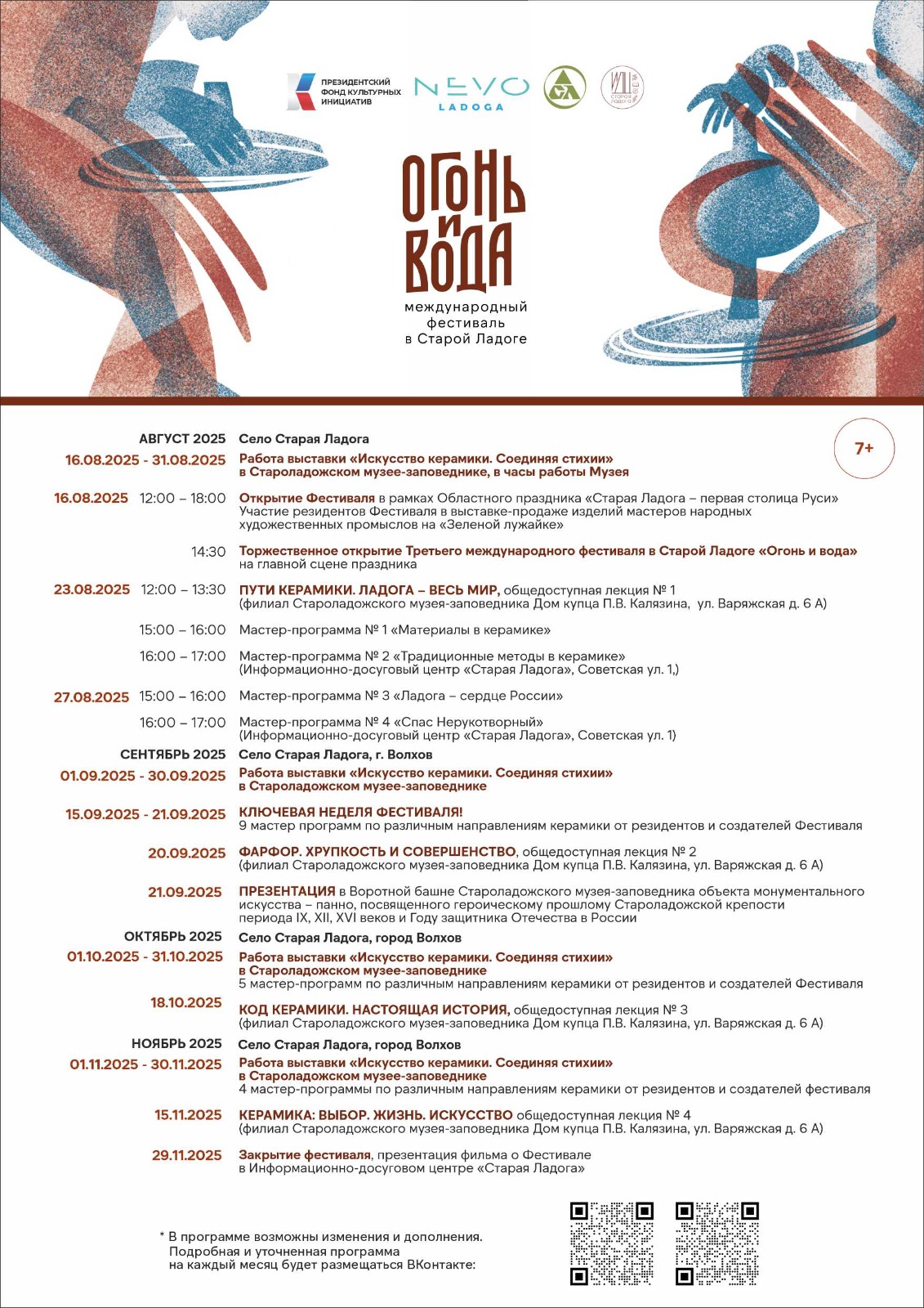 от создателей и резидентов Фестиваля, 4 общедоступные лекции по искусству керамики, выставка о фестивале в Староладожском музее-заповеднике, премьера фильма об участниках, резидентах, партнерах и команде фестиваля.