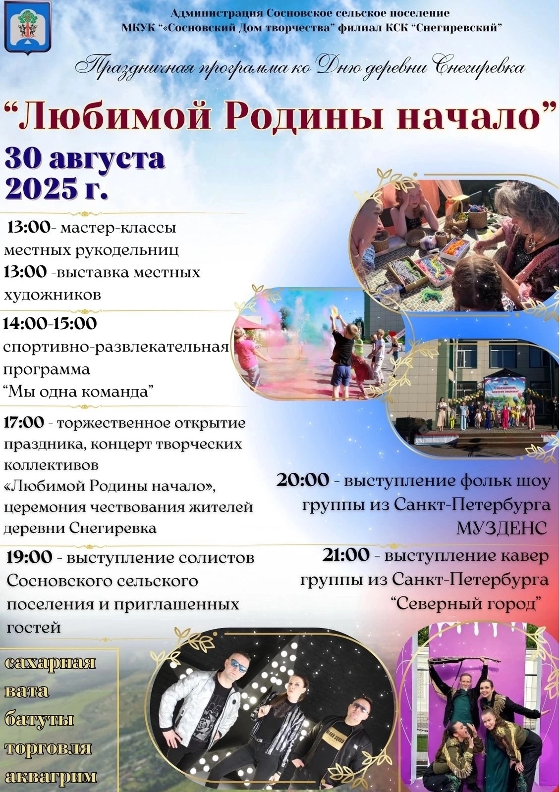 Скоро нас ждёт яркое и душевное событие — День деревни Снегирёвка! Это праздник, где каждый найдёт что-то по душе: от торжественных моментов до весёлых развлечений.