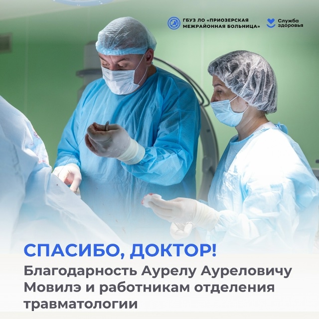Татьяна Ш. пишет: «Хочу выразить огромную благодарность Врачу с большой буквы Мовилэ Аурелу Ауреловичу и всему его отделению травматологии ГБУЗ ЛО «Приозерская МБ».