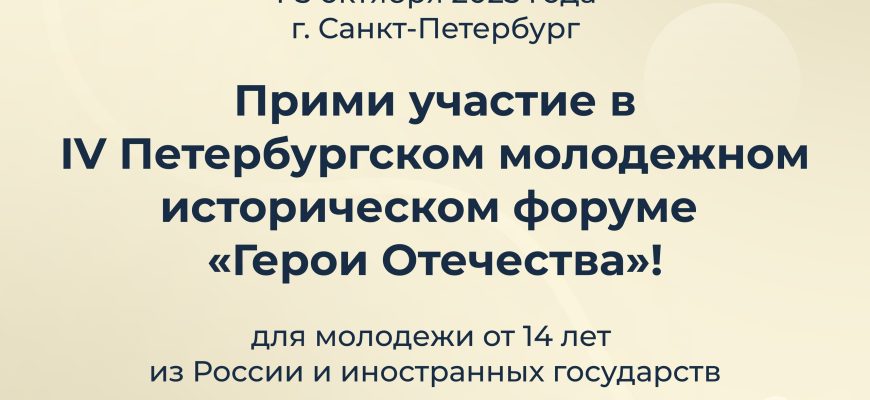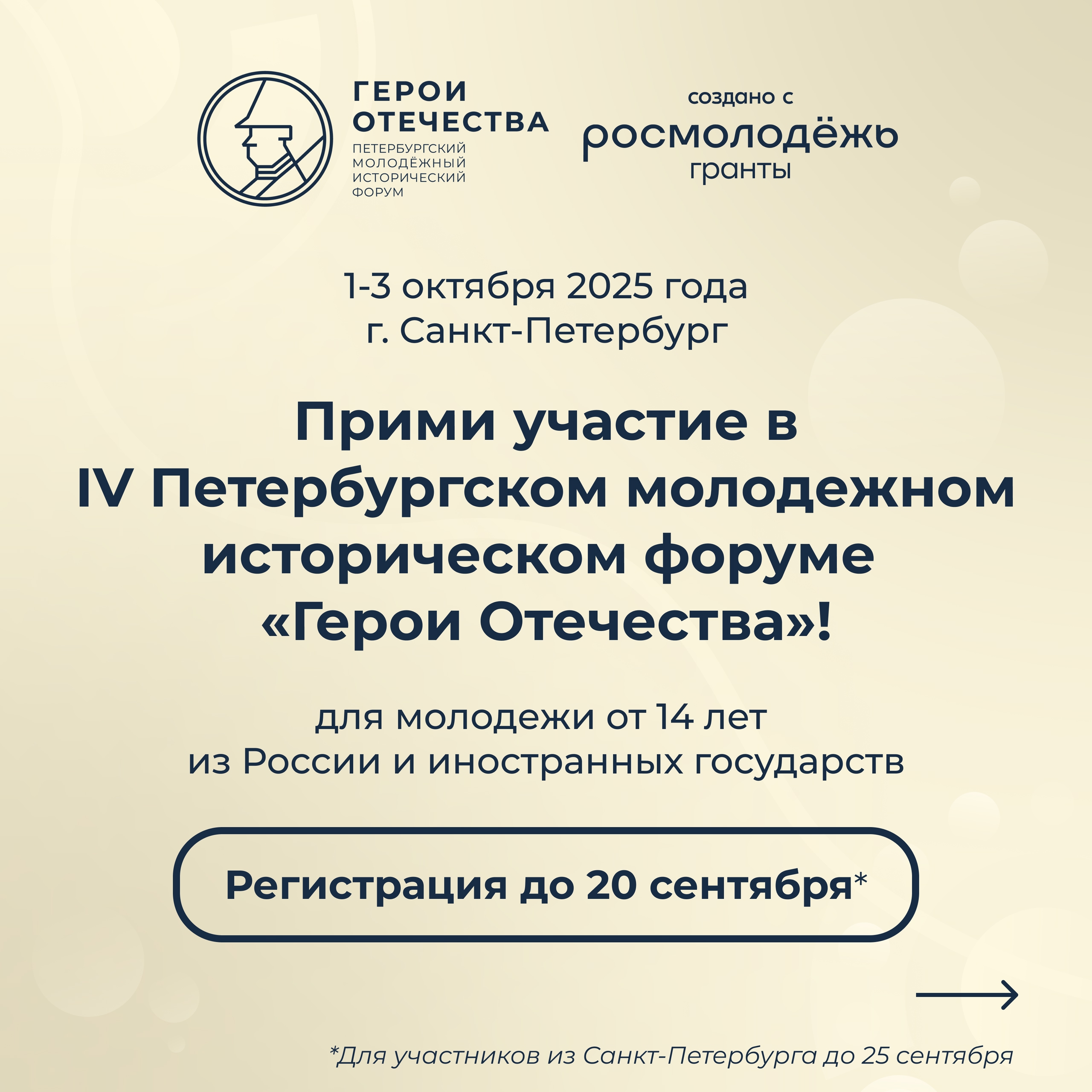 Открыта регистрация на IV Петербургский молодежный исторический форум «Герои Отечества», который пройдет с 1 по 3 октября в Санкт-Петербурге!