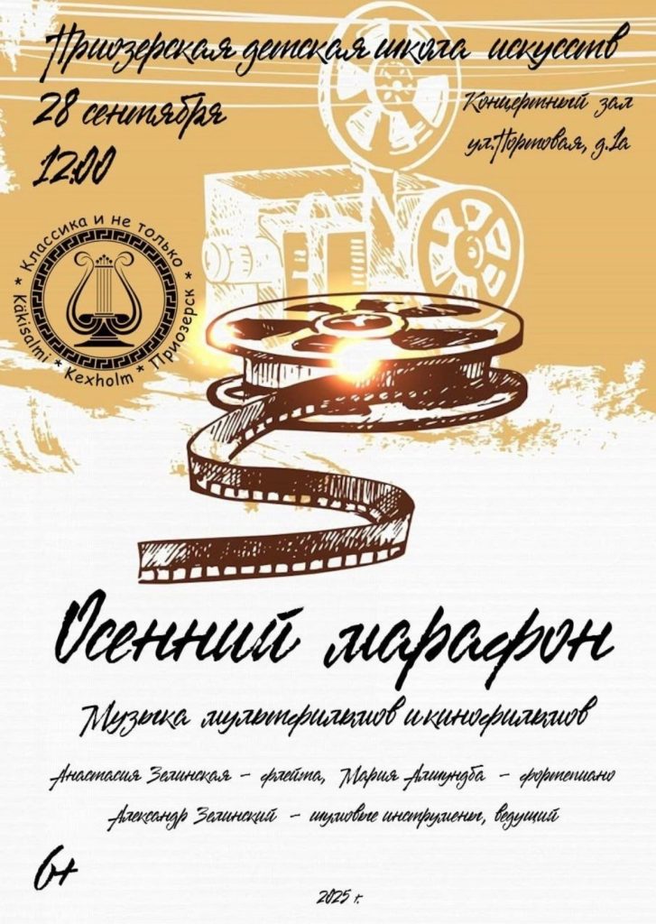 28 сентября в 12:00 концерт для более юной аудитории «Осенний марафон», музыка из мультфильмов и кинофильмов.