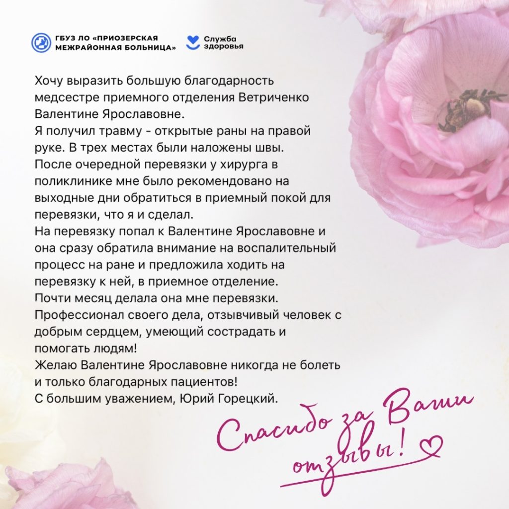 «Хочу выразить большую благодарность медсестре приемного отделения Ветриченко Валентине Ярославовне.