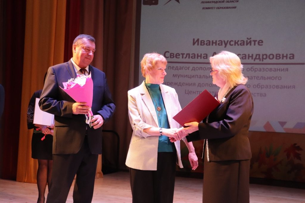 К поздравлениям и награждениям присоединилась Ирина Кравченко – председатель комитета образования администрации Приозерского района, почетный работник воспитания и просвещения Российской Федерации. В своём обращении она подчеркнула важную роль в жизни учителей педагогов-наставников и ветеранов педагогического труда.