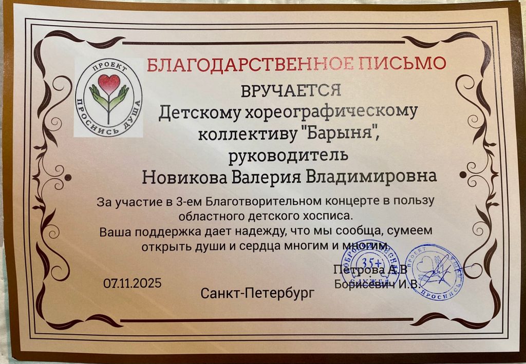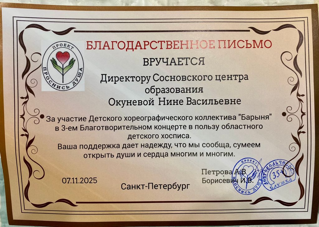 Хореографический коллектив « Барыня» в лице руководителя Новиковой Валерии Владимировны благодарит за помощь в организации поездки директора МОУ « Сосновский центр образования» Окуневу Нину Васильевну!