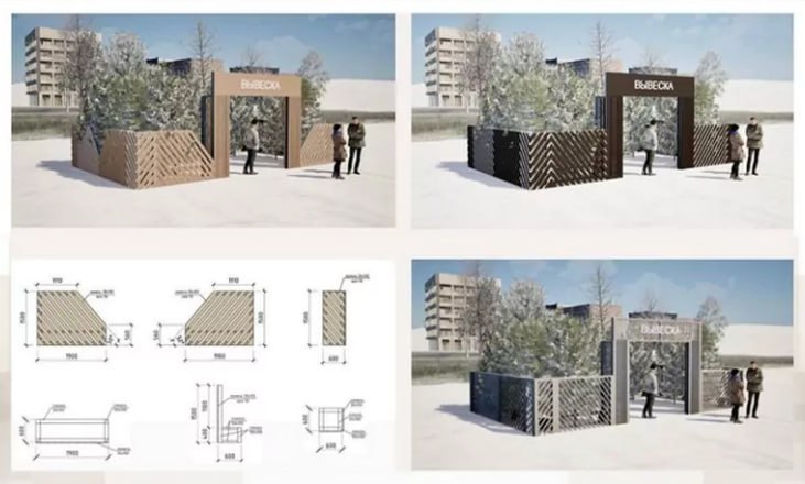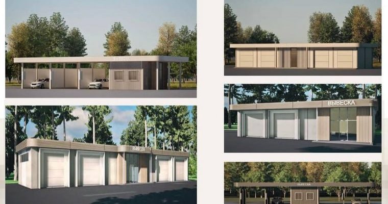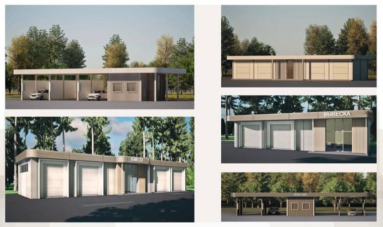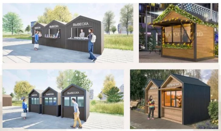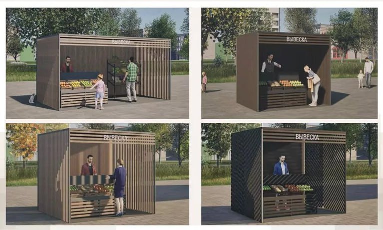Возможно так это будет выглядеть, фото по порядку: автомойки, овощные и фруктовые лавки, ярмарочные домики, ёлочные базары.