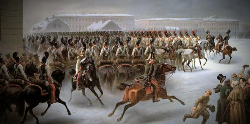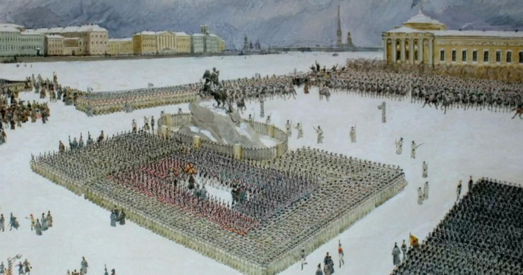 Восстанию на Сенатской площади предшествовал период так называемого междуцарствия. Наследником императора Александра I был его следующий по старшинству брат – великий князь Константин Павлович, который сочетался браком с женщиной не царственной крови и в 1821 году был вынужден отречься от права на престол, однако отречение не было официально опубликовано. Александр I издал манифест, в котором наследником объявлялся другой его брат – великий князь Николай Павлович. Об этом обстоятельстве знали лишь несколько человек во всей империи и поэтому, когда 18 ноября 1825 года Александр I скоропостижно скончался, гвардия присягнула Константину Павловичу, который был наместником Царства Польского и находился в Варшаве. Но тот дважды подтвердил отречение. Таким образом возникло безвластие, была назначена переприсяга, что в Российской империи «было чем-то невозможным», потому что присяга – это клятва, и гвардейцы, которые только что поклялись в верности одному императору, не понимали, почему они должны приносить клятву кому-то другому. Ситуацией воспользовалось Северное тайное общество, убедив часть гвардии, что новая присяга незаконна. Русский поэт, публицист Николай Огарёв писал: «…а в Петербурге в день присяги, / был бунт, исполненный отваги…»