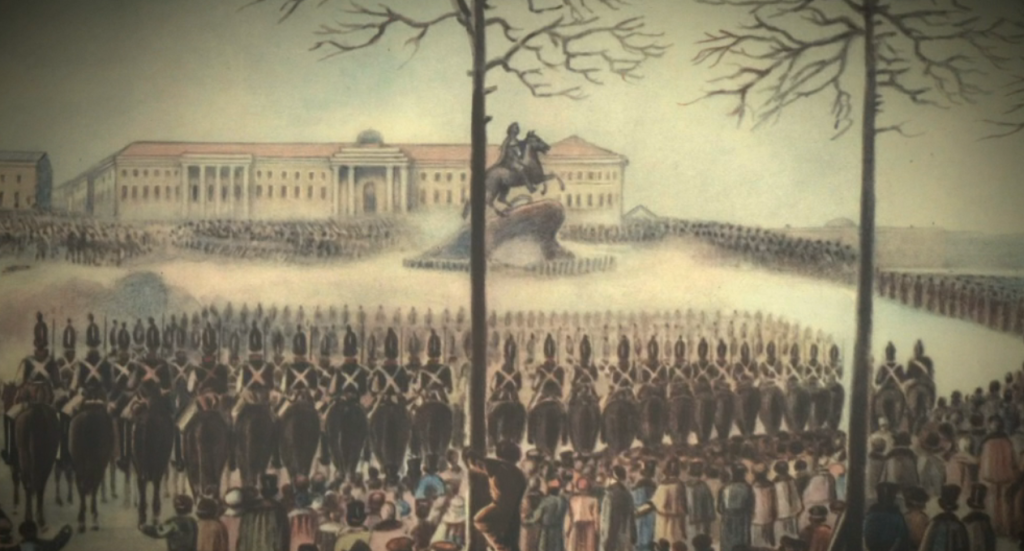 Историк Яков Гордин отмечает, что восстание 14 декабря 1825 года часто называют «вялым, стоячим», но на самом деле это не так. Гордин полагает, что «лидерами тайного общества был разработан очень дельный боевой план». Стояла задача взять под контроль Зимний дворец, арестовать императорскую семью, после чего захватить Сенат и Петропавловскую крепость. Однако этот план не сработал, потому что начались разногласия внутри самого тайного общества. В результате декабристы – около 3 000 человек, оказались окружены правительственными войсками численностью в 12 000 штыков и сабель, которые удалось собрать императору Николаю I. Восставшие отчаянно защищались, отбивая атаки кавалерии, но против них «пустили артиллерию, и боевые порядки декабристов были расстреляны картечью в упор». В этот день было много убитых и раненых, в том числе и среди мирных людей, которые пришли на площадь. Восстание было подавлено.