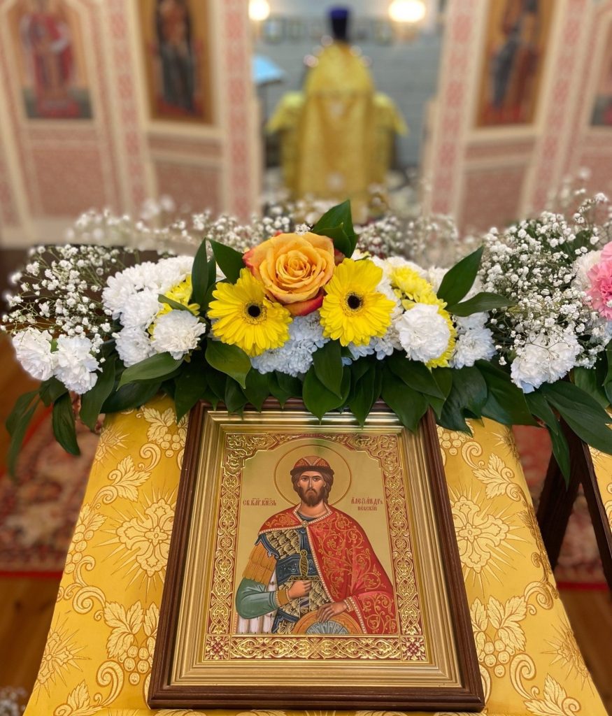 Закончилось праздничное богослужение Крестным ходом и славословием святому князю Александру.