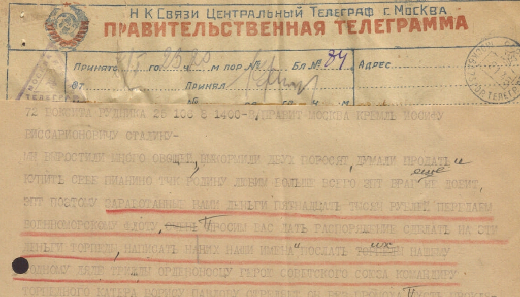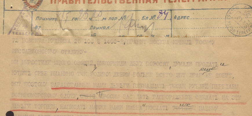 8 января 1945 года в Кремль пришла телеграмма, адресованная Иосифу Сталину. В ней школьницы рассказали о своей давней мечте: «Мы вырастили много овощей, выкормили двух поросят, думали продать их и купить себе пианино. Но Родину любим больше всего. Враг ещё не добит, поэтому заработанные нами деньги – 15 000 рублей, передаём Военно-морскому флоту».