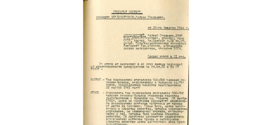 Среди публикуемых документов — выписки из актов о злодеяниях немецко-фашистских захватчиков в Гатчинском районе, копия приговора Военного трибунала Ленинградского фронта от 9 апреля 1944 года в отношении фигурантов дела, протокол допроса главного судмедэксперта Ленинградского фронта Андрея Владимирского, а также акт судебно-медицинской экспертизы, датируемый 20-22 февраля 1944 года.