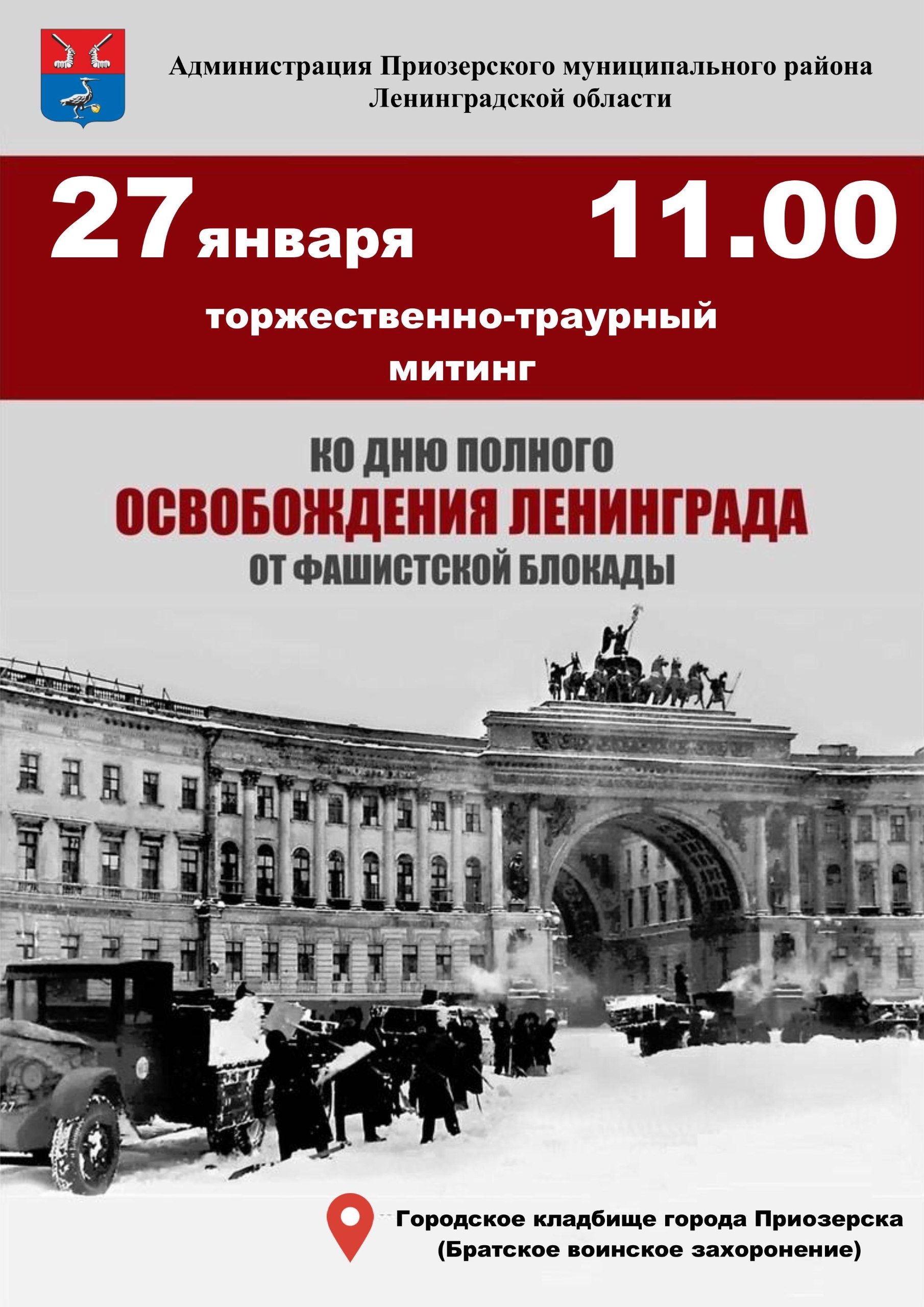27 января… День, когда сердца наши замирают в скорбном молчании, а память возвращает нас в трагические годы блокадного Ленинграда. В 11.00 у братского воинского захоронения на городском кладбище Приозерска соберутся те, кто хранит в душе огонь памяти о жертвах и героях тех страшных дней.