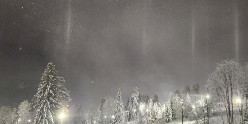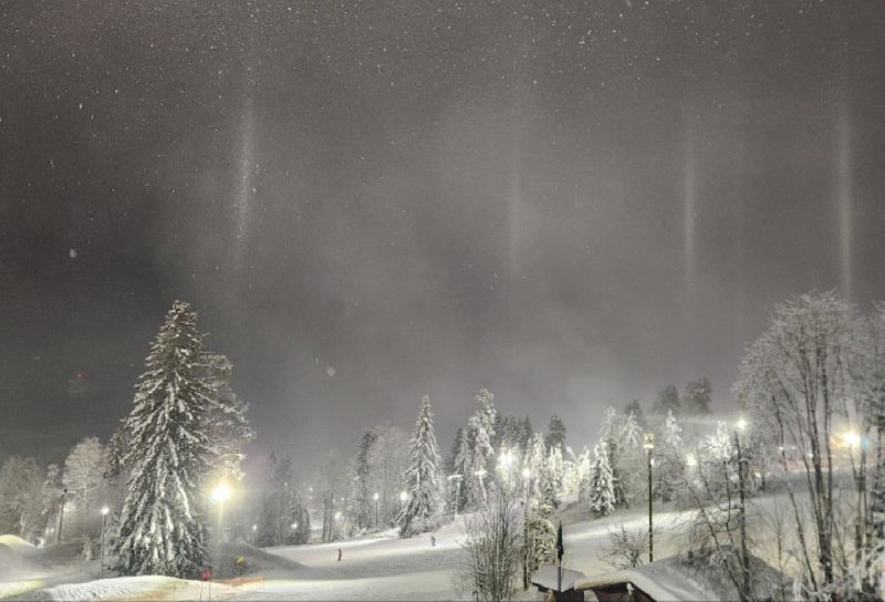 Очевидцы отметили, что подобное зрелище удается увидеть нечасто. Световые столбы придали зимнему пейзажу курорта сказочный вид и стали одним из самых ярких природных явлений этой зимы.