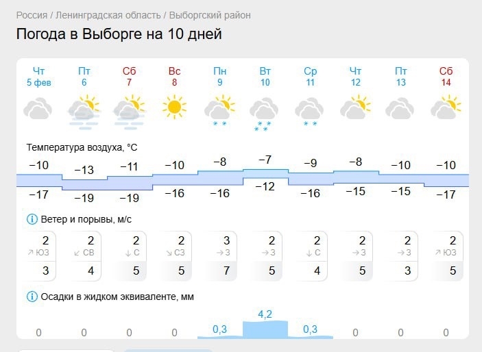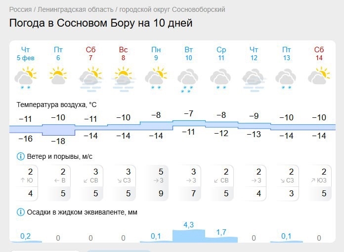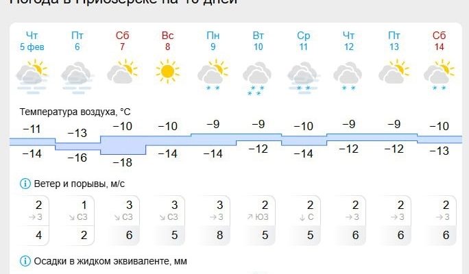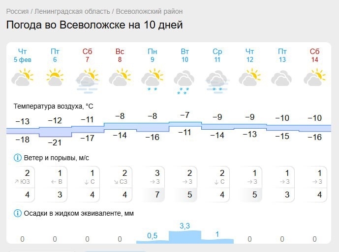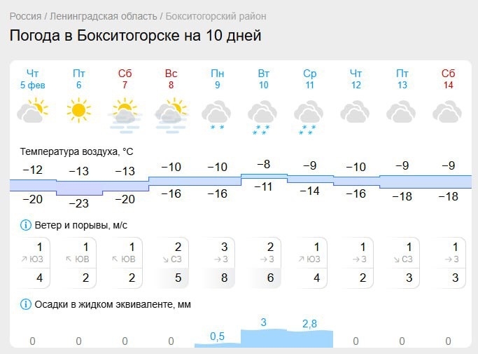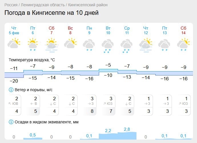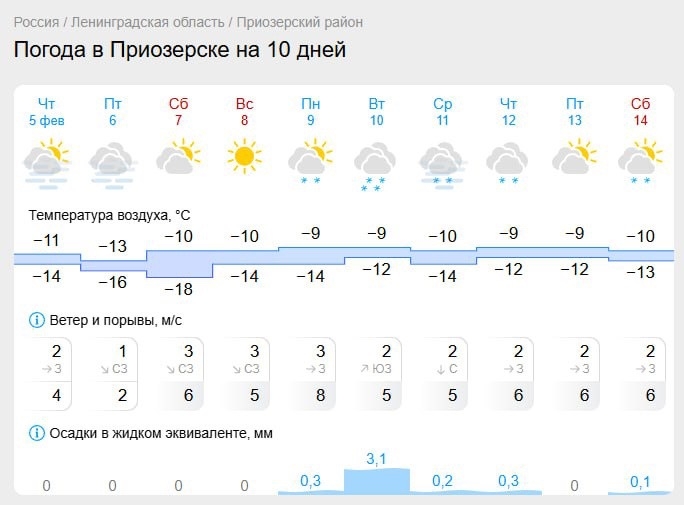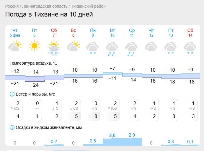 В соответствии с прогнозом GisMeteo, холоднее всего будет в Тихвине и Киришах – там температура опустится до -24 градусов. Теплее всего – в Сосновом Бору и Приозерске, где столбики термометров покажут -18.