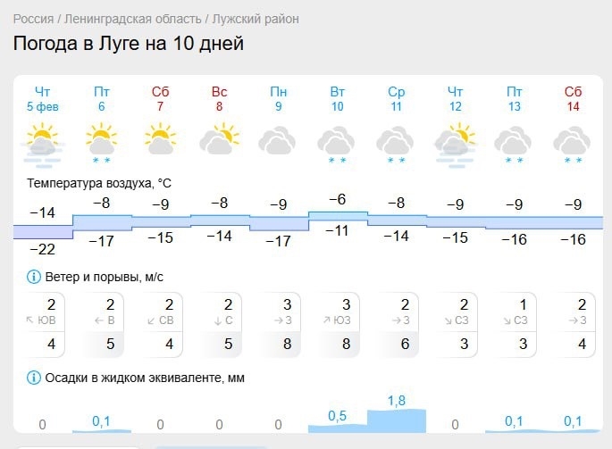 По прогнозу «Северо-Западного УГМС», в пятницу, 6 февраля, местами ожидается изморозь, температура воздуха ночью опустится до -22…-27 гр. В субботу, 7 февраля, ночная температура воздуха составит -19…-24 гр.