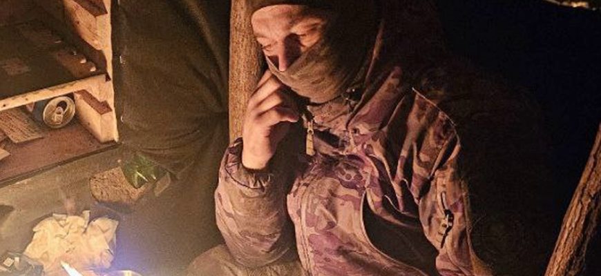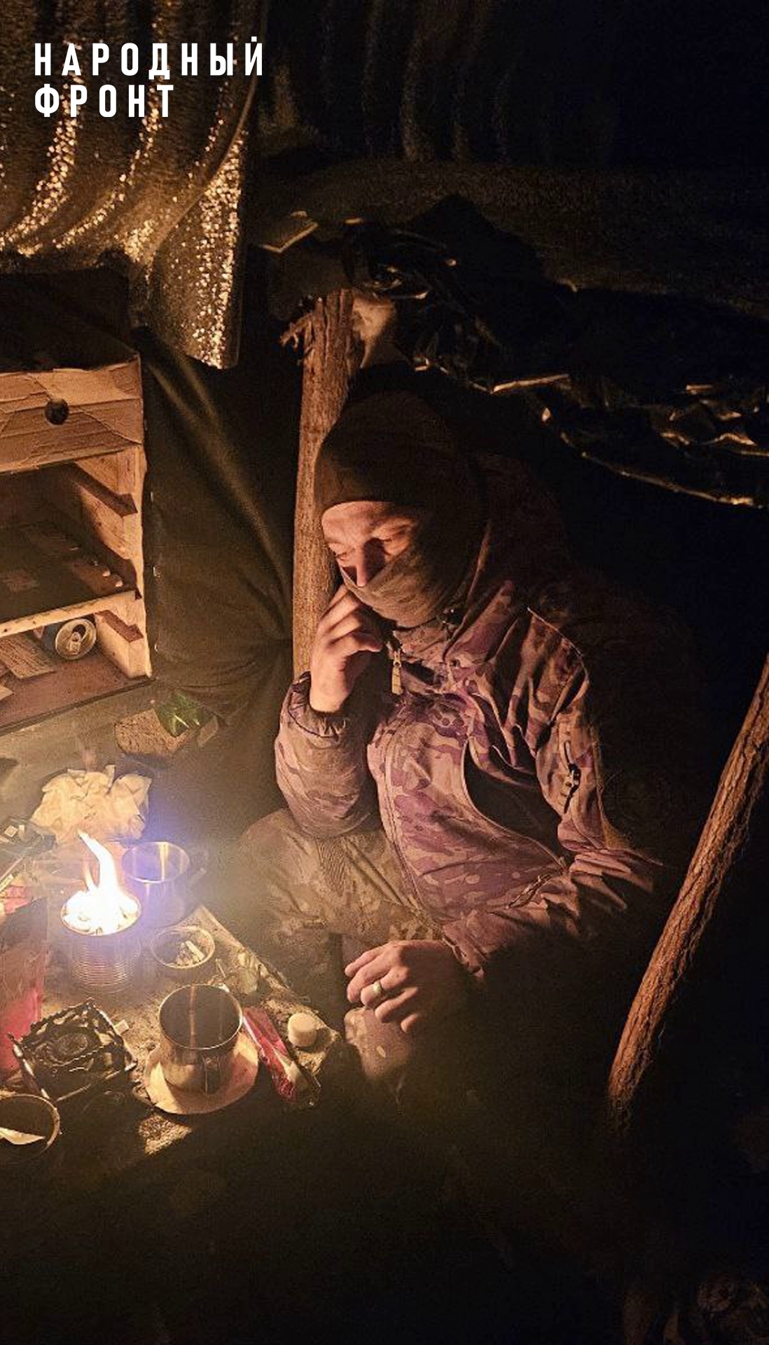 Военный с позывным «Валет» вернулся с боевого задания и отдыхает за самодельным столом. После тяжелого дня ему очень хочется посидеть в тишине и в тепле. Окопные свечи, которые передавал Народный фронт от волонтёров группы «ДУШевная посылка», греют нашего защитника на запорожском направлении.