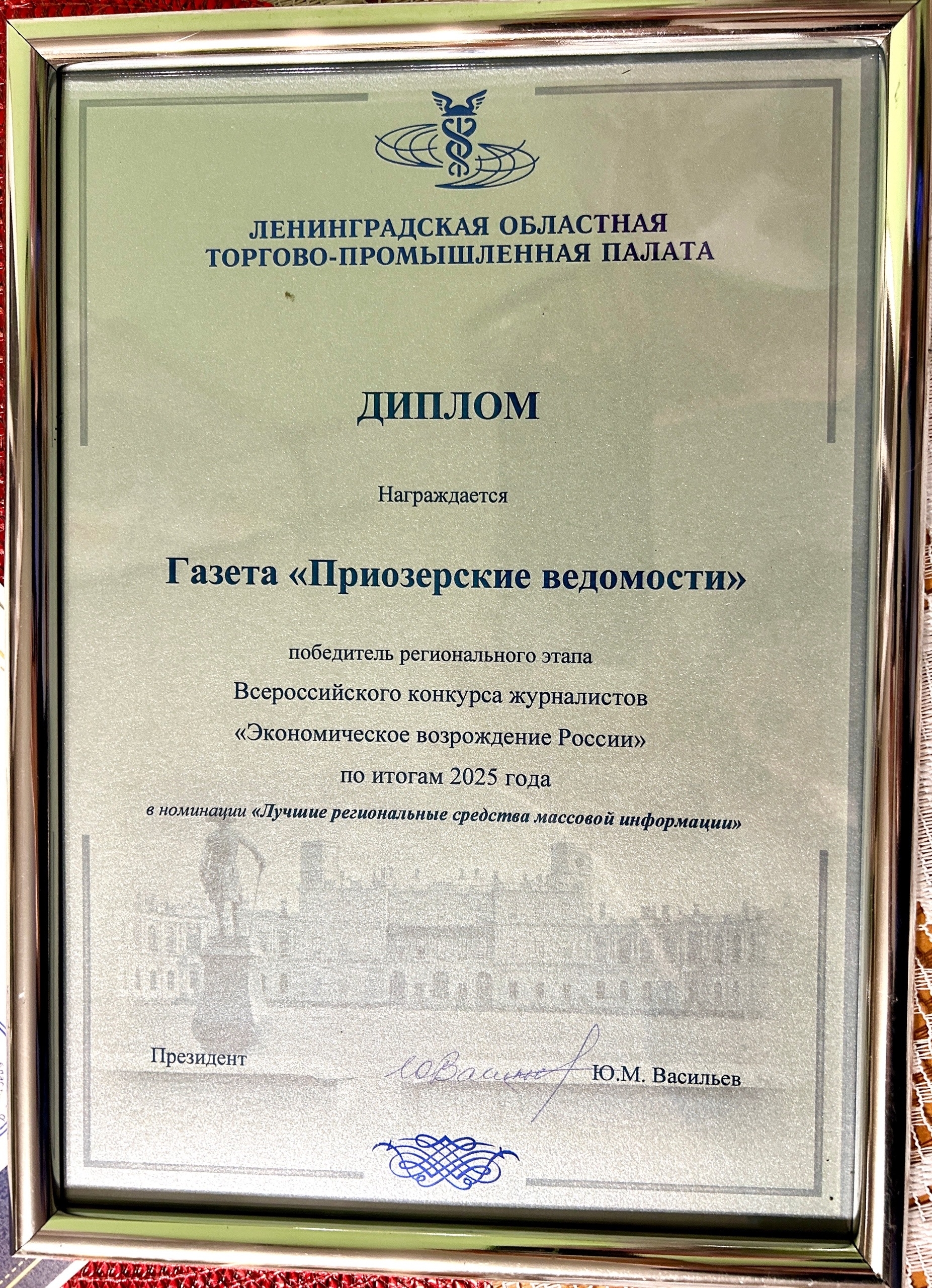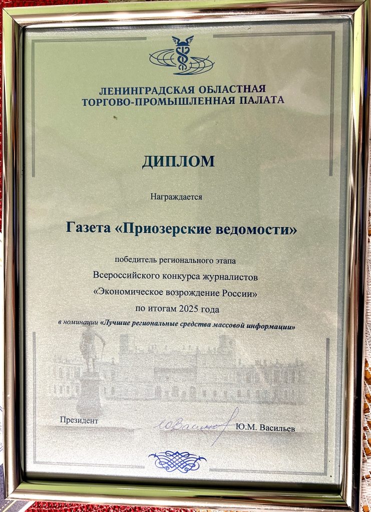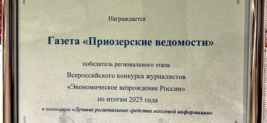 В среду, 18 февраля, редакция газеты «Приозерские ведомости» получила награду за победу в региональном этапе Всероссийского конкурса журналистов «Экономическое возрождение России» по итогам 2025 года в номинации «Лучшие региональные средства массовой информации».
