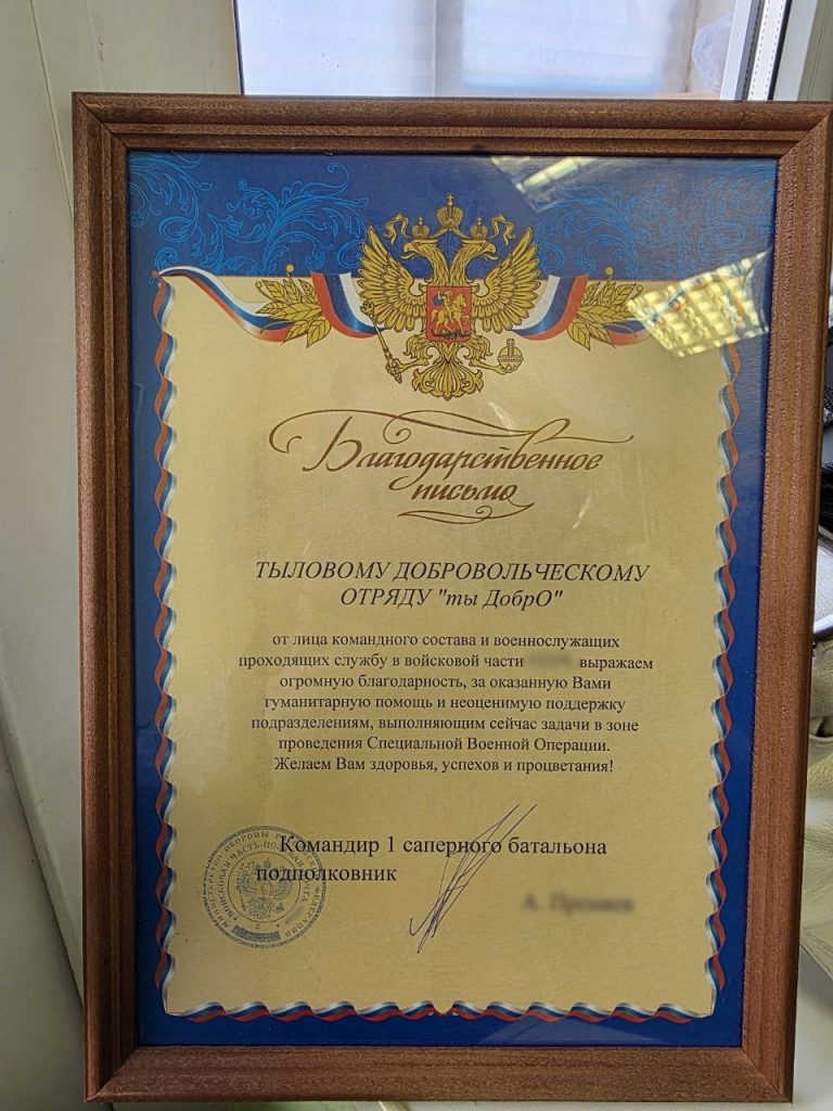 В среду, 25 февраля, супруга участника СВО спозывным «Ленин» Елена Е. вручила волонтерам добровольного отряда «ТыДобро» и помощнику главы администрации Приозерского муниципального района по вопросам СВО Ирине Соколовой Благодарственные письма и цветы из-за ленточки от военнослужащих и командного состава войсковой части, которой они оказывают постоянную гуманитарную помощь.