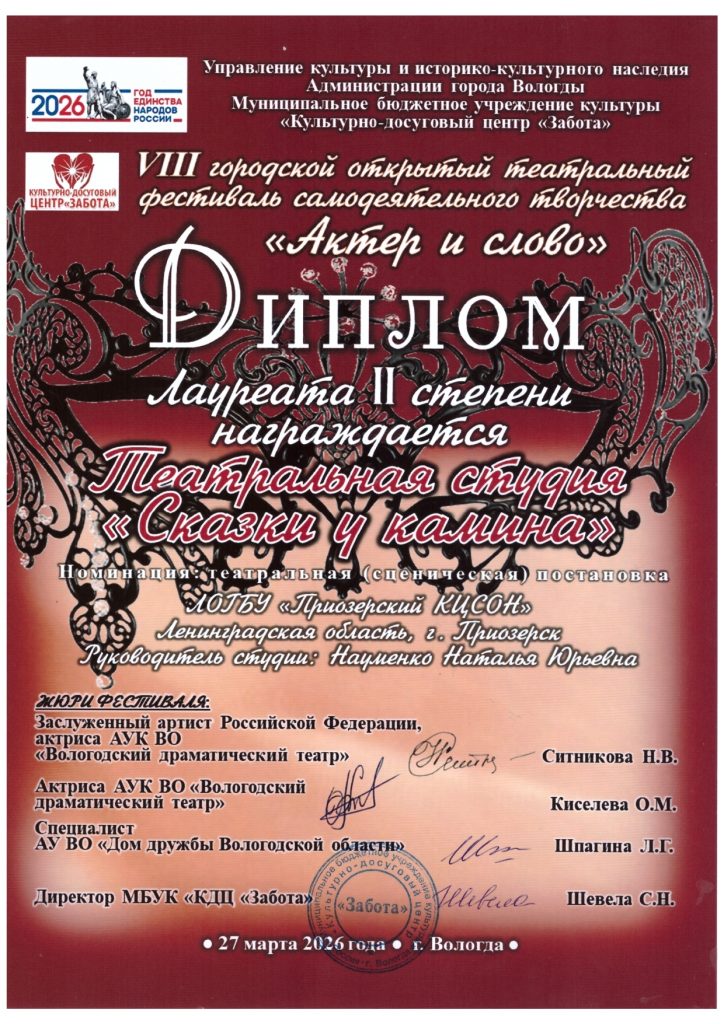 В этот особенный день коллектив ЛОГБУ «Приозерский КЦСОН» отправился в прекрасную Вологду, чтобы принять участие в VIII городском открытом театральном фестивале самодеятельного творчества #Актер_и_слово. И знаете что? Они вернулись с заслуженной наградой – Дипломом Лауреата 2 степени!