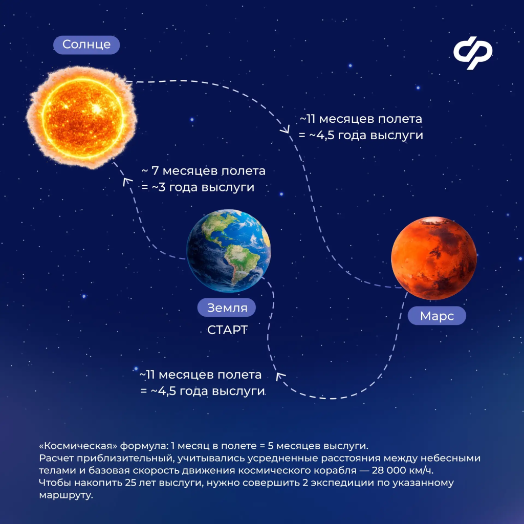 🚀 Получается, что если мужчина-космонавт устроит непрерывный космический полет в течение 5 лет, то после стыковки с Землей как раз накопится нужная выслуга для выхода на пенсию — 25 лет.