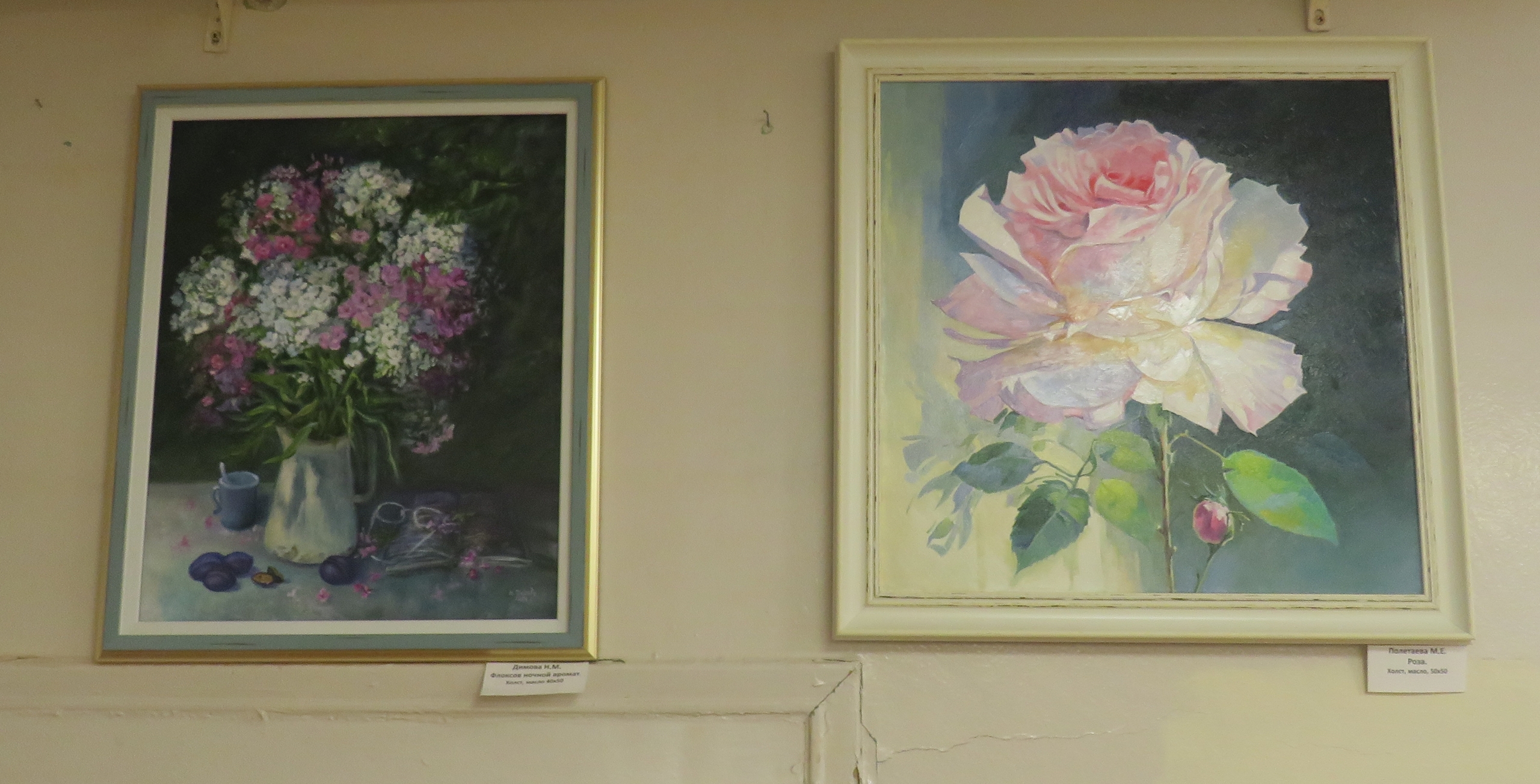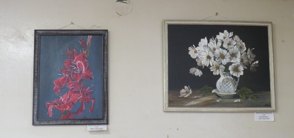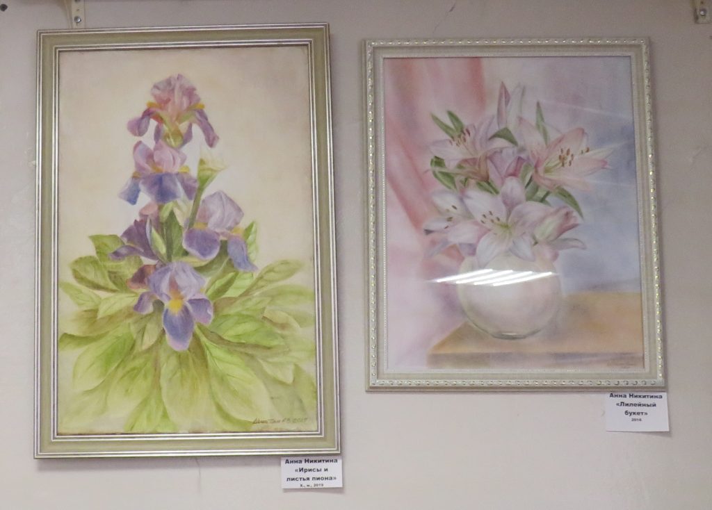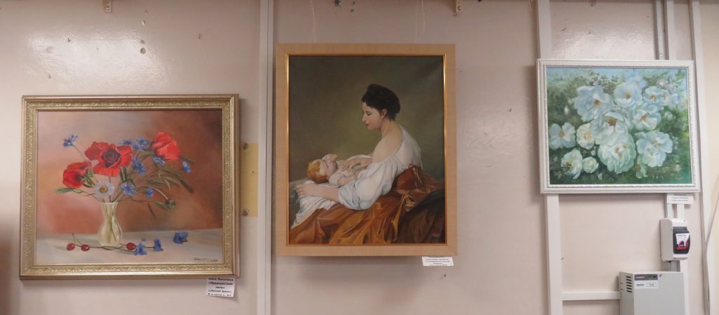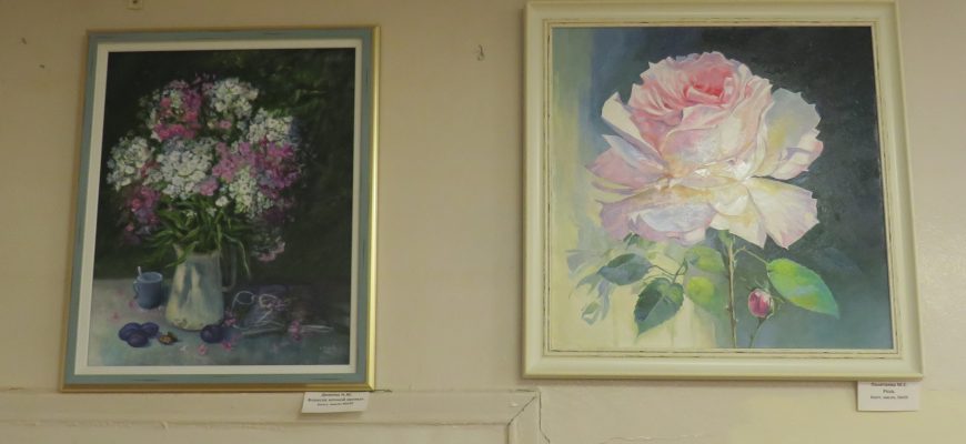 Среди работ: трепетная роза, нежные ирисы, яркие маки, сонная Ладога, мать баюкающая младенца, весенний деревенский дворик.