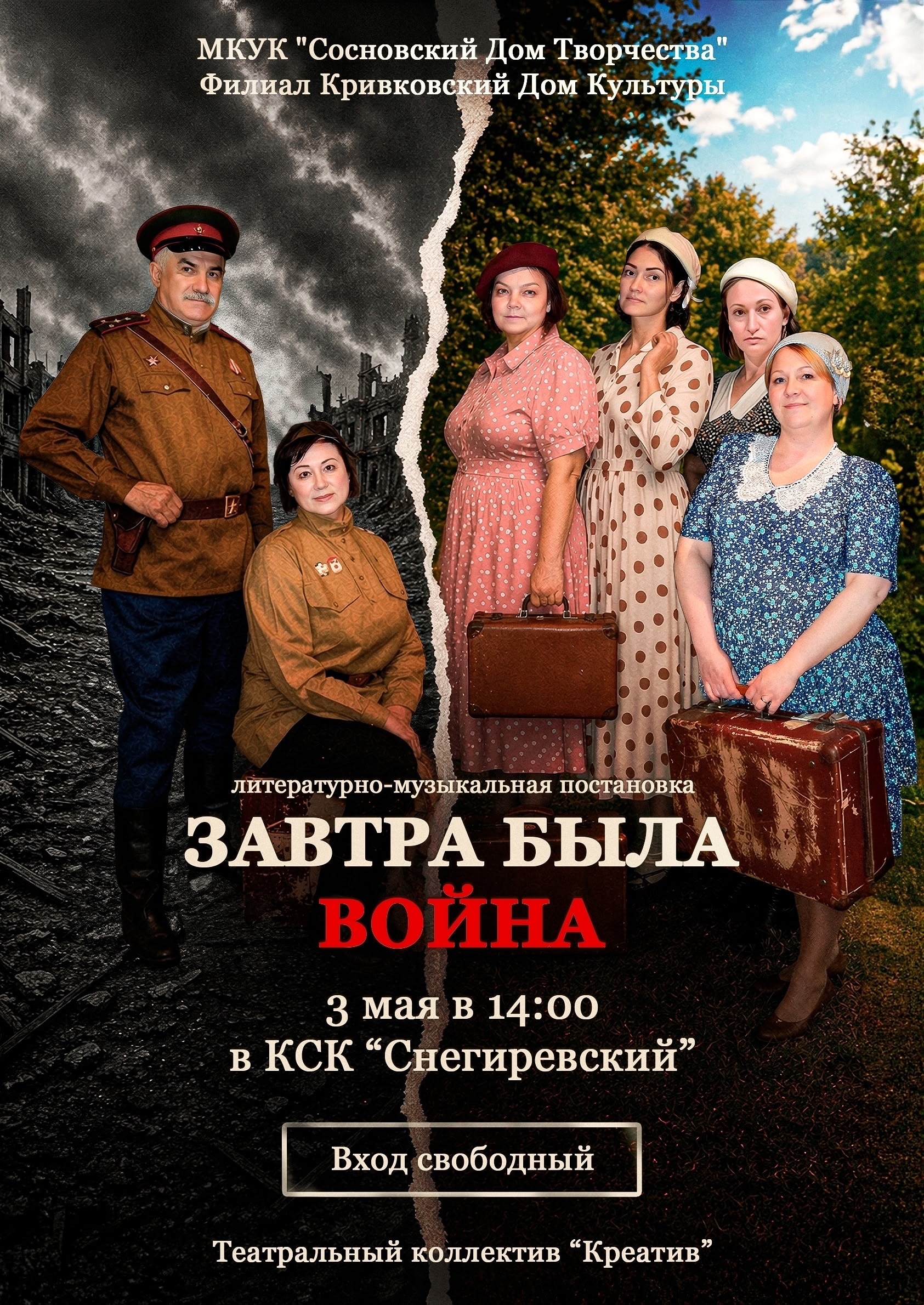 Театральный коллектив «Креатив» приглашает вас на литературно- музыкальную постановку — «Завтра была война», посвященную 81-й годовщине Великой Победы. Этим спектаклем, мы отдаём дань глубокого уважения и благодарности каждому, кто воевал на передовой и в тылу. ВЕЧНАЯ ПАМЯТЬ!