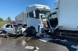 Вечером 12 сентября под Санкт-Петербургом легковой автомобиль оказался зажат между двумя грузовиками.